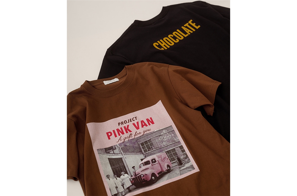 「ADAM ET ROPÉ’(HOMME)」と、世界中で愛されるチョコレートブランド「GODIVA」による異色のコラボレーションが実現。今作は第二次世界大戦後に配達用の車をピンクに塗装し、戦後の荒廃地に立ち向かう人々へチョコレートを届けたという「GODIVA」のエピソードに感銘を受け、そのピンクバンのグラフィックを施したTシャツやトートバッグをラインナップ。また、1月30日(土)から2月14日(日)の期間中にコラボレーションアイテムをご購入していただいたお客様に、先着で「GODIVA」のチョコレートをプレゼントという粋な計らいも。