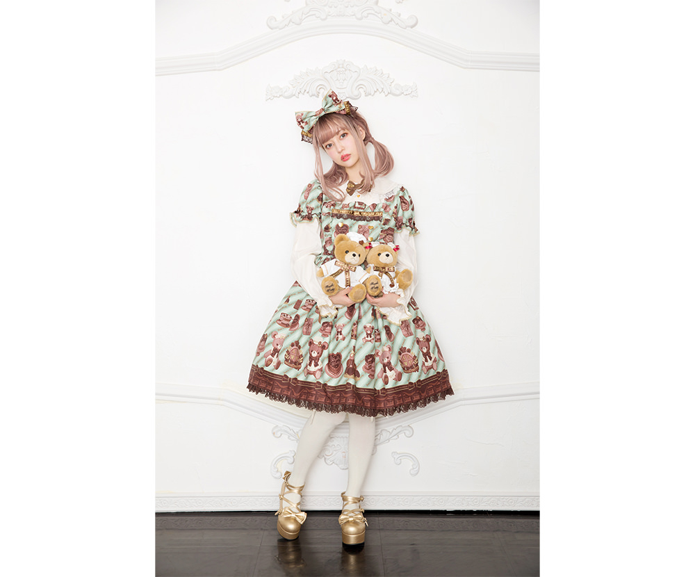 幼い頃に憧れた、絵本の中のお姫様が着ていたようなレースやフリル、リボンがたくさんあしらわれた可愛い洋服たち。そんな夢見る心を忘れずに、いつまでも可愛くありたいと願う女の子たちのためにある「Angelic Pretty」。新作「くまちゃんのショコラトリー」はパリのショコラトリーなどをアイデアソースに、くまちゃんショコラティエが作るキュートなチョコレートのお菓子運ぶウェイトレスを表現。一部の店舗では限定カラーも入荷予定。