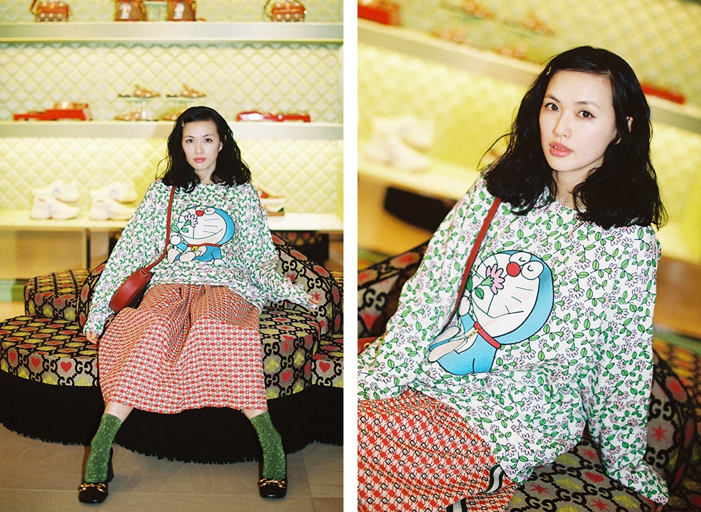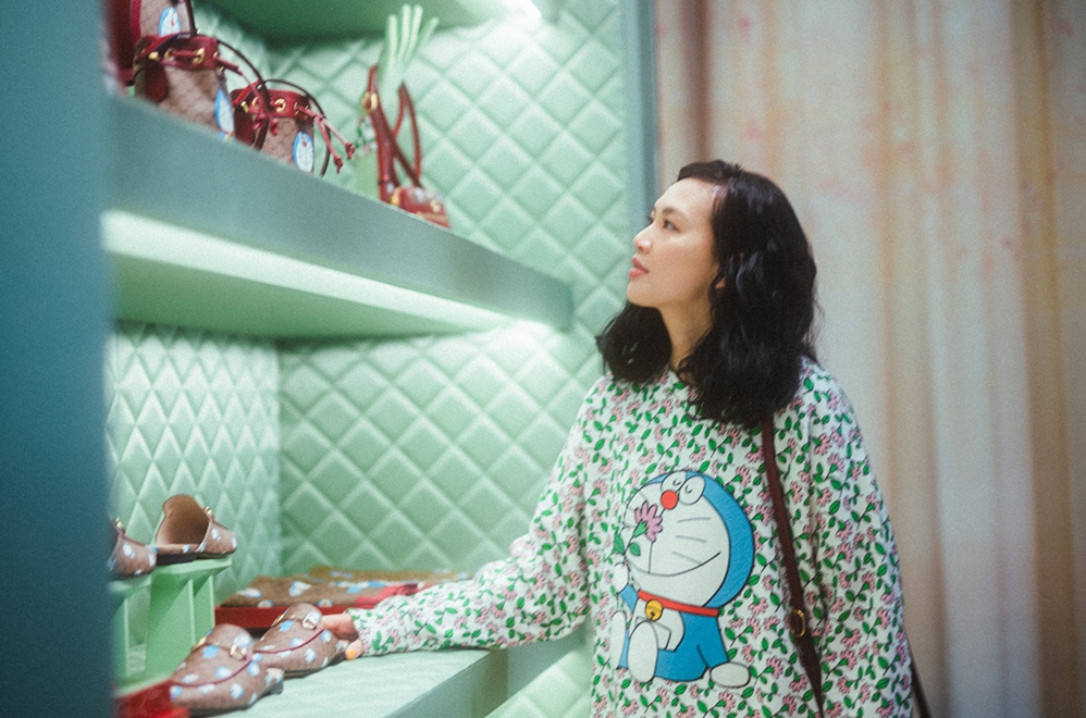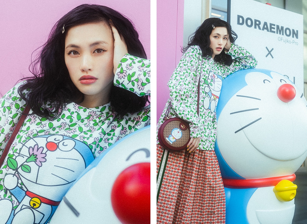 GUCCIを象徴するミニGGパターンや華やかなフラワーパターンに、キュートな表情のドラえもんがプリント。日本のポップアイコンとして世界でも人気を集めるドラえもんと、グッチのコラボレーションは、まさに人気者同士が出会った遊び心たっぷりのコレクションとなっている。「娘がドラえもんファンなので、自慢しようと思っています」と笑顔で話す臼田さん。巨大ドラえもんと背比べをしたり、どこでもドアを再現したディスプレイに興味津々。