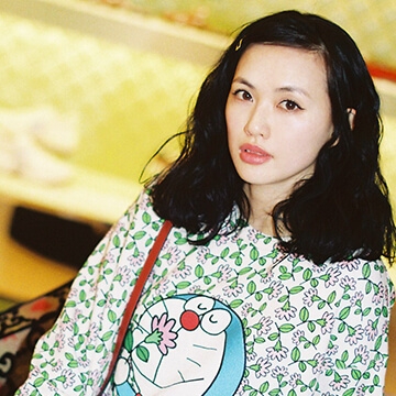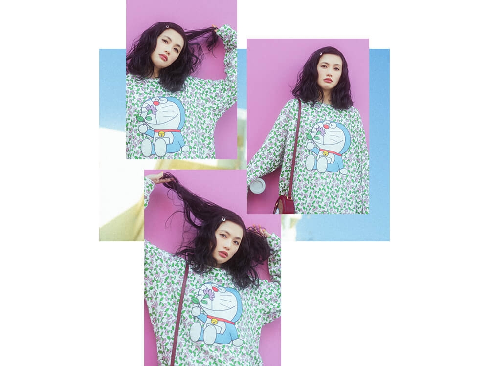 「服は、ピンクやオレンジなどの色物が好き」と臼田さん。そんな彼女が着用したトップスは、誰もが一瞬で目を奪われるような鮮やかな色使いのフラワープリントに、無邪気なドラえもんがなんとも愛らしい一着。Gのモチーフがジオメトリックに配されたスカートと組み合わせることで、キャラクターコーデの中にモードなセンスを宿らせて。
