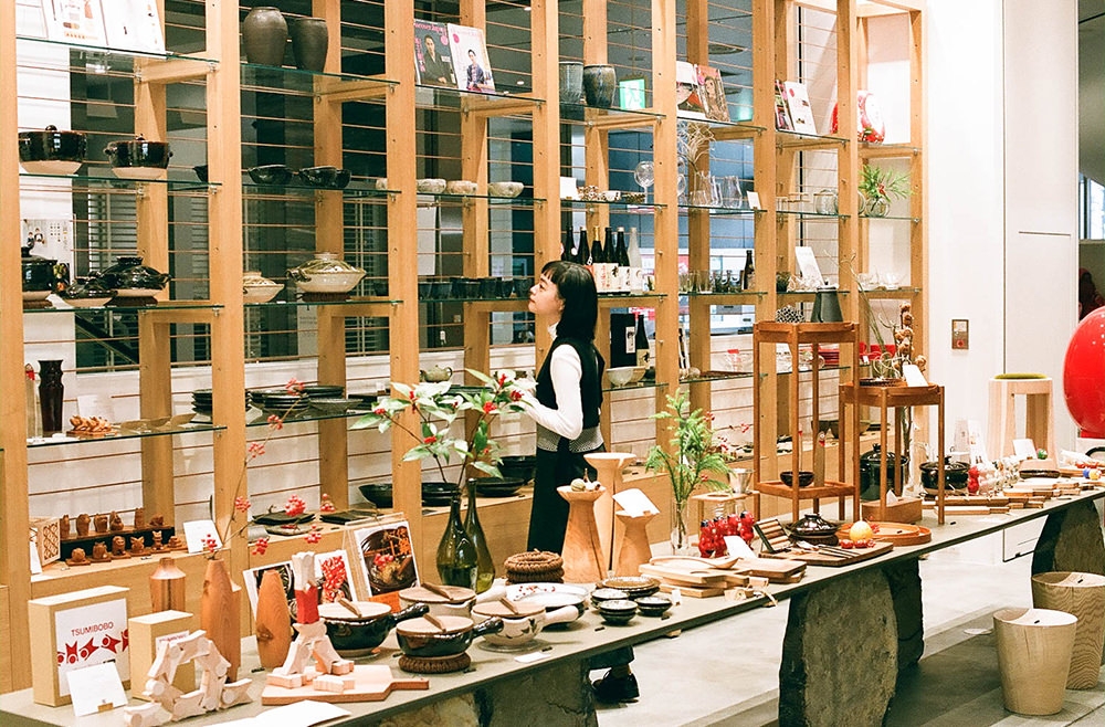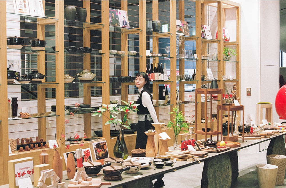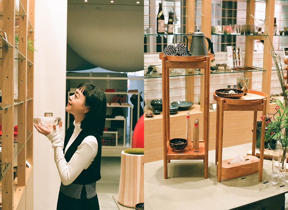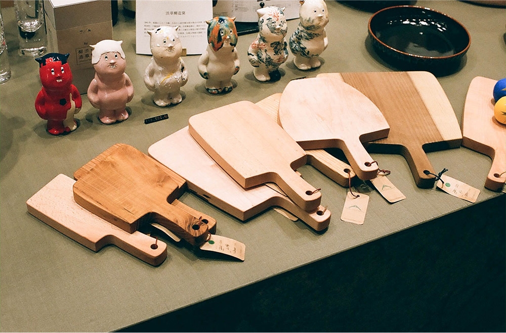 店の中央には大きな漆塗りのテーブルが置かれ、卓上には気になる商品がずらりと並ぶ。なかでも、ひと際目を惹くカッティングボードは、岐阜県産の山桜など国産の広葉樹を使用した飛騨の木工ブランド「ARTS CRAFT JAPAN」製作のもの。Kanocoさんも、普段から大小2枚の木のまな板を愛用しているという。「普段のお料理は大きいもの、フルーツだとかをちょっと切りたいなって時は小さいもの。何枚かあるとすごく便利ですよね」。店内をくまなく歩きまわりながら、歴史に育まれた温もりのある暮らしの道具たちを、興味深げに見ていた。