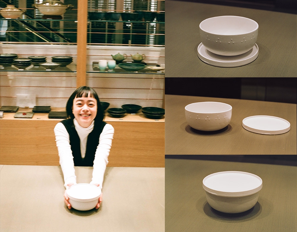 お店に入ると一目散にカウンターに向かう。出来上がったどんぶりを手に「素敵に仕上がっていて嬉しい!」と満足気。「フタをつけて3WAYで使えるようにしたんです。どんぶりのフタとしても、薬味や箸休めを盛る小鉢としても、それからどんぶりの受け皿としても。受け皿として使った時にグラグラしないよう、器の高台をなくしました」。料理をしたりごはんを食べたり……、Kanocoさんが丁寧に暮らす日々の経験のなかから生まれたアイデアを、ギュッと凝縮してデザインに落とし込んだのだとか。