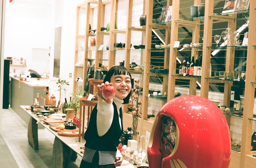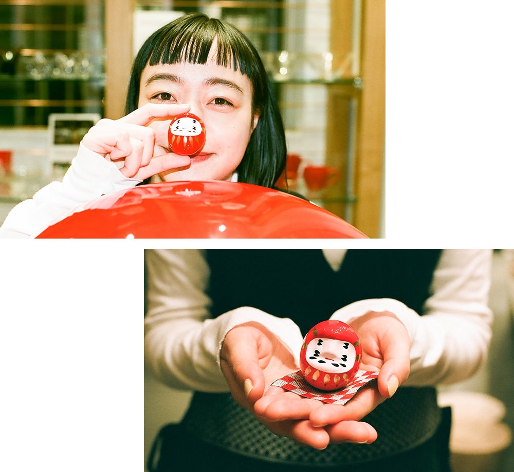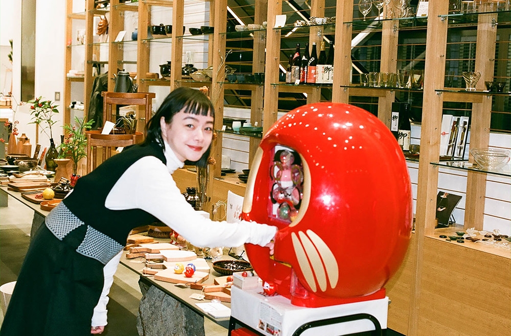 仕上がったどんぶりを心ゆくまで見た後は、大きなだるま型のガチャガチャで運だめし。カプセルに入っている小さな白河だるまの色で、風水的な意味あいが変わるそう。気になるKanocoさんの運勢は……、なんと大願成就の赤! 嬉しい結果に、思わず満面の笑顔が咲く。店内には他にも、おうち時間が快適になる木工のトレーテーブルやティッシュボックス、不安定な時代をともに乗り越えようというメッセージを込めたアマビエさまラベルの大吟醸酒・出羽桜などが所狭しとひしめく。