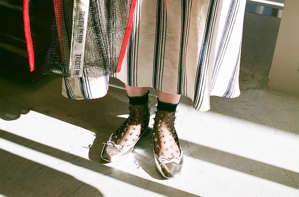 メッシュバッグは、Kanocoさんが色別注したという赤と青の2色展開。それぞれに彼女のクリエーションを落とし込んだシースルーソックス1型がセットになる。ソックスには小さなファーがところどころにあしらわれていて、履くとまるで足元に小さな花が咲いたよう。 「履き口にブルーのラインをさり気なく効かせてみました。デコラティブなデザインだから、これぐらい控えめなほうが大人っぽく履けそうだなって」。