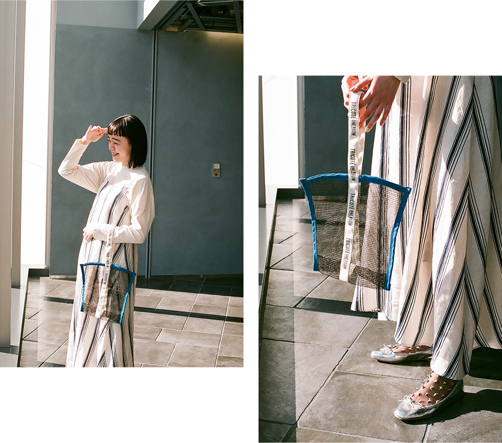 「透け感のあるものは、引き続きこの春夏も流行りそうな気がしてます。このソックスは、バレエシューズにあわせて履きたいなと思って作りました。古着が好きなんですけど、例えば古着のTシャツとデニムとバレエシューズをあわせるとか。それ、絶対にやりたいです!」 また、メッシュバッグのパイピング部分には、Kanocoさん好みの2色をチョイス。「必要なものだけ入れて、いろんなところに遊びに行きたいですね」と、バカンス気分が高まるバッグを手に、今から自由に出かけられる日を心待ちにしているようだ。