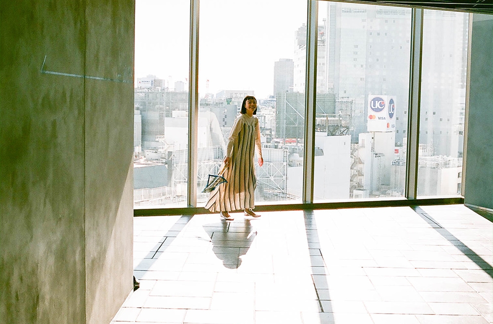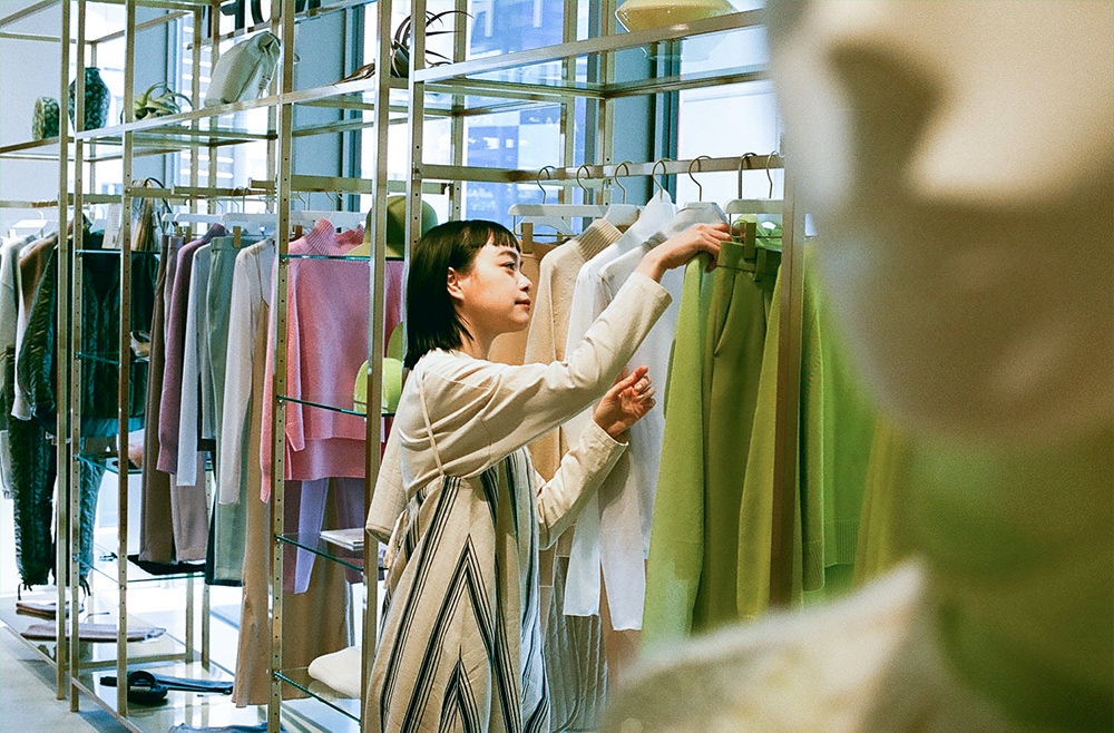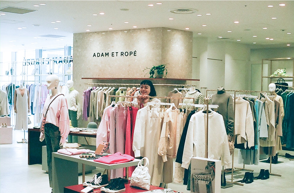 「Build Color Build Form」をシーズンテーマに掲げて、ポジティブなカラー展開をしているADAM ET ROPÉ FEMME。広々とした店内は、ピンク、グリーン、パープルといった美しい色彩に溢れ返っていて、気持ちも足取りも弾む。「年々ピンクが好きになりますね」と話すKanocoさんも、服がかかったラックを渡り歩くごとに、つい立ち止まっては物色の手が止まらない。その様子は、まるで花から花へと自由に往来する蝶のようだ。