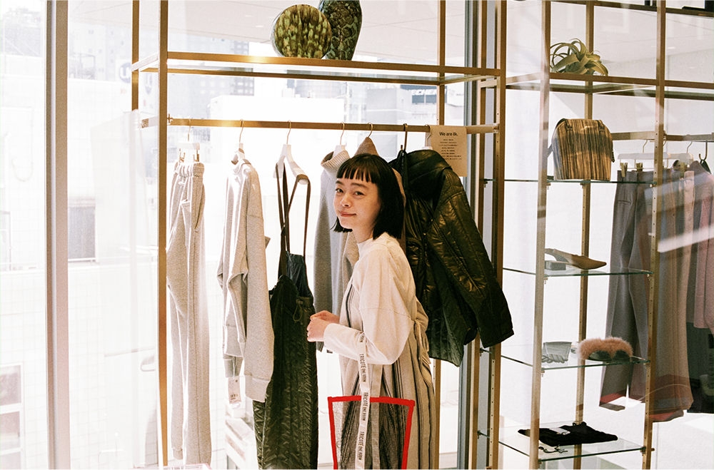 Kanocoさんが訪れたのは、渋谷PARCO4FにあるADAM ET ROPÉのウィメンズショップ。売り場には、KanocoさんとADAM ET ROPÉ、そして先シーズンからセレクトを開始したばかりのライフスタイルブランド「TRICOTÉ(トリコテ)」のトリプルタッグで作り上げた、メッシュバッグとシースルーソックスのセットが置かれている。ともにTRICOTÉの人気小物で、どちらもKanocoさんが普段のコーディネートに取り入れたいデザインということで、自然と期待が高まる。