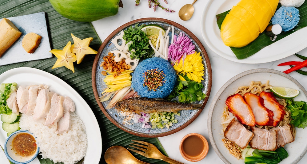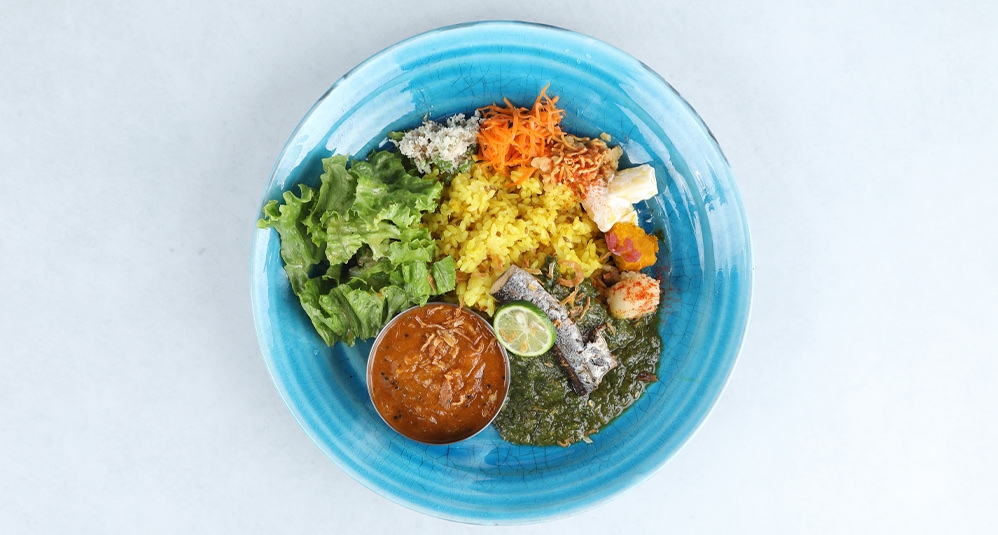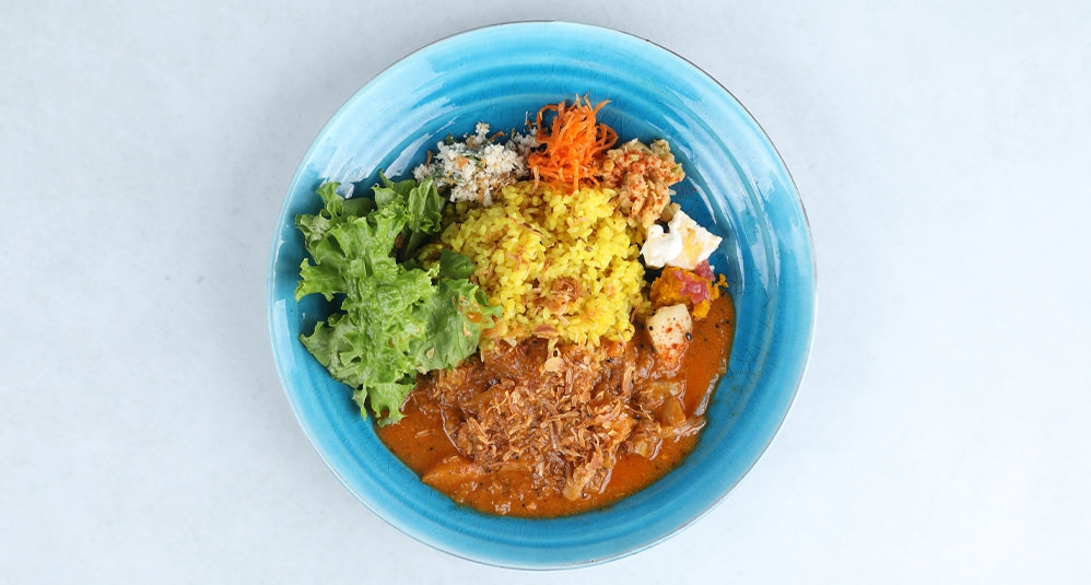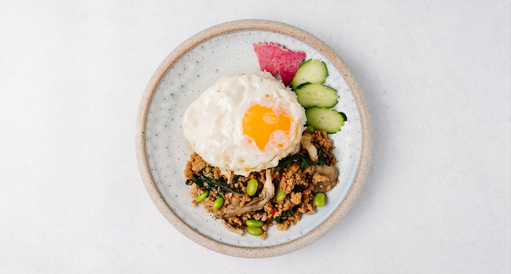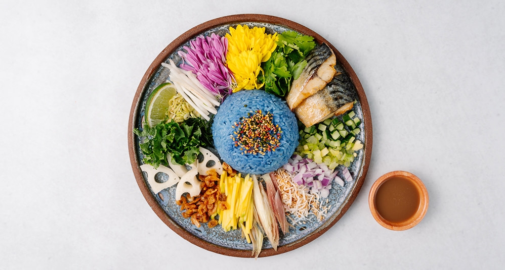 タイ料理の奥深さを感じられるメニューが揃う「chompoo」。添加物や化学調味料は使用せず、ハーブや発酵食品を使って食材の旨みを丁寧に引き出している。人気メニューの鯖のカオヤムは、ブルーのジャスミンライスと魚や野菜など様々な具材を混ぜていただく一品。1ヶ月に1500食を売り上げた驚異の記録を持つ「究極のガパオ」は、ナンプラーやスパイスで鶏ひき肉とガパオリーフを炒め、高級ジャスミンライスと共にいただく香り豊かな一皿。新作のタイの海老味噌混ぜご飯は、自家製のカピを贅沢に使用。甘く炊いた豚肉や卵焼きを混ぜて召し上がれ。