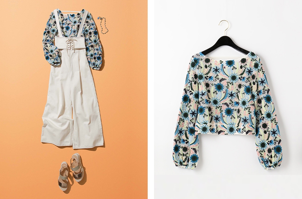 「ORIGINATED IN GRACE CONTINENTAL」が提案する、フロント部分のレースアップがポイントのハイウエストワイドデニムに、ブランドらしい華やかな刺繍テクニックが光るフェミニンなフラワー柄トップスを合わせたコーディネート。フランス製の希少なパーツを使用したターコイズネックレスは華美になりすぎず、カジュアルな中にも女性らしい彩りを添えてくれるはず。春のお出かけにいかが?
