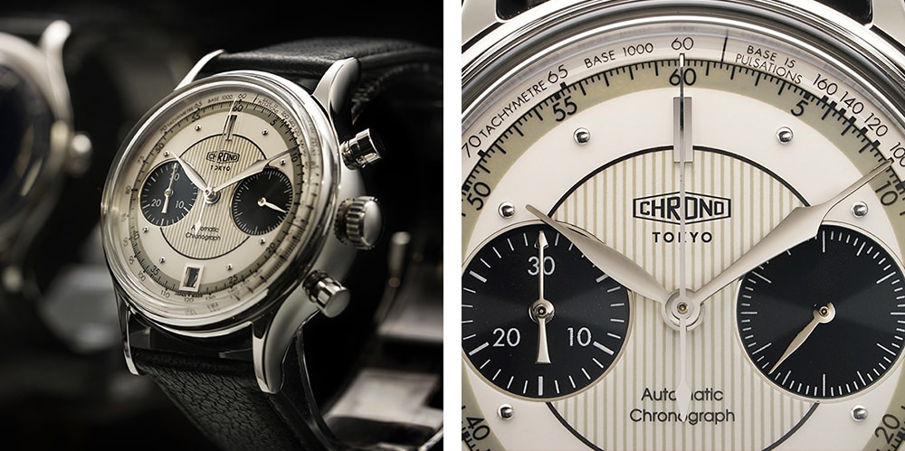 独立時計師・浅岡肇氏がデザイン、設計する機械式腕時計ブランド「CHRONO TOKYO」のクロノグラフ。自らもクロノグラフマニアでもある浅岡氏が、特に文字盤の作り込みにこだわり、艶のある塗装、膨らみのあるボンベダイヤル、立体的なドットインデックス、ブルズアイの塗分け、インダイヤル外周のダイヤカットなど、ヴィンテージのデザインエレメントを現代の高度な加工技術で再構成している。
