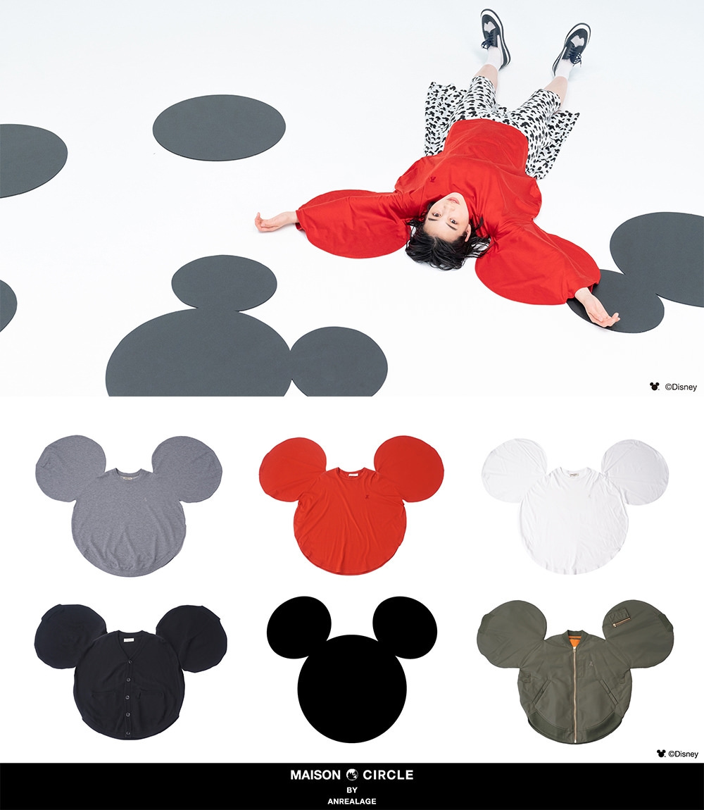 ANREALAGEでは、“WEARABLE MICKEY(ミッキーを着る)”をテーマに、ミッキーマウスを洋服の形に変換したラインナップを発表。人の体に準拠しないミッキーマウスの形をした洋服は、千差万別な体型の違いを超越し、体型差によるサイズロスを削減。素材は、天然由来・リサイクル原料にこだわり、オーガニックコットンや再生ポリエステル、染色工程を踏まない原着ポリエステル等、資源の有効活用が可能な素材を用いている。