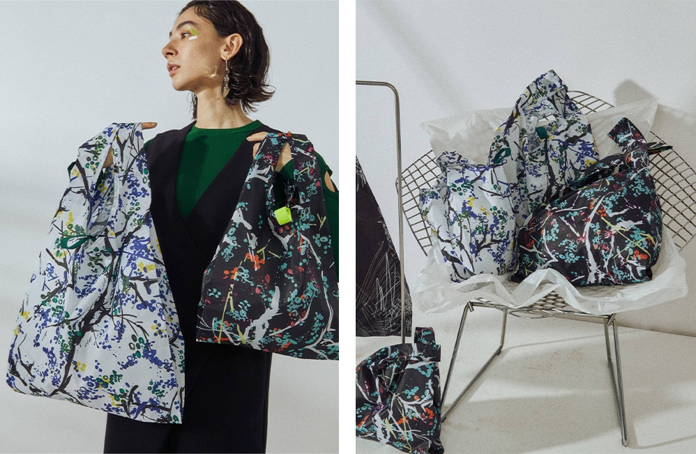 構築的なタックや複雑なプリーツなど、エッジの効いたコレクションで定評のある「UN3D.」。2021年春夏の新作コレクションが並ぶストアでは、ペイントアーティストKANAKO SASAKI氏による、今季のオリジナル柄をプリントしたエコバッグを販売。丸めてゴムで留めるだけでコンパクトにまとまるので、サブバッグにもおすすめだ。イベント期間中は、エコバッグを持参または購入で、10%OFFでショッピングが可能。