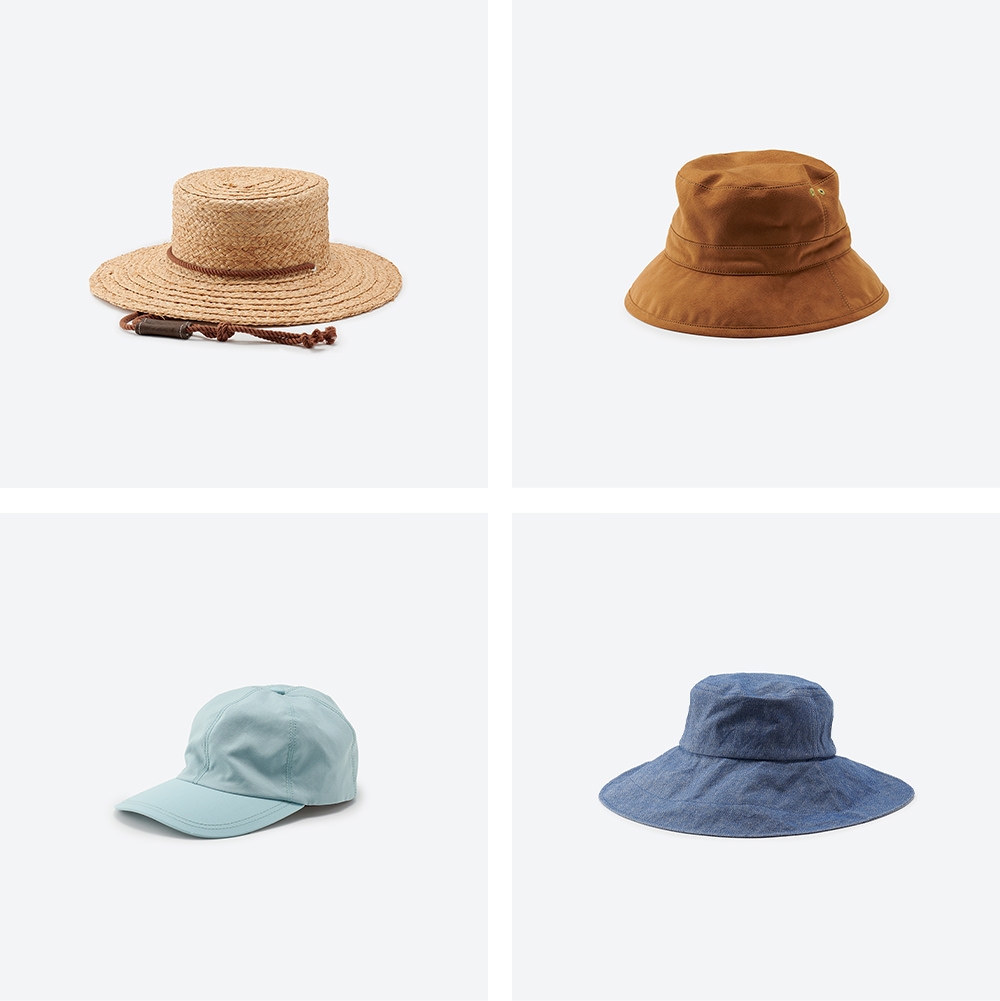 (上)ボーターハット¥22,000、エコスエードのバケットハット¥14,300(下)6パネルキャップ ¥15,400、ワイドブリムバケットハット ¥22,000