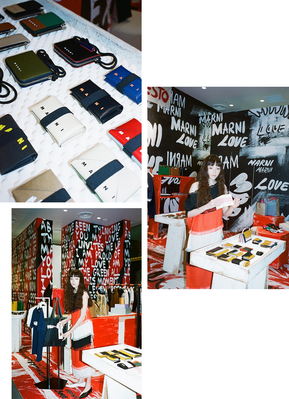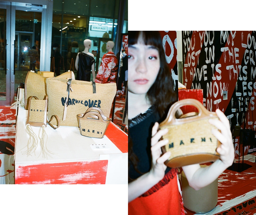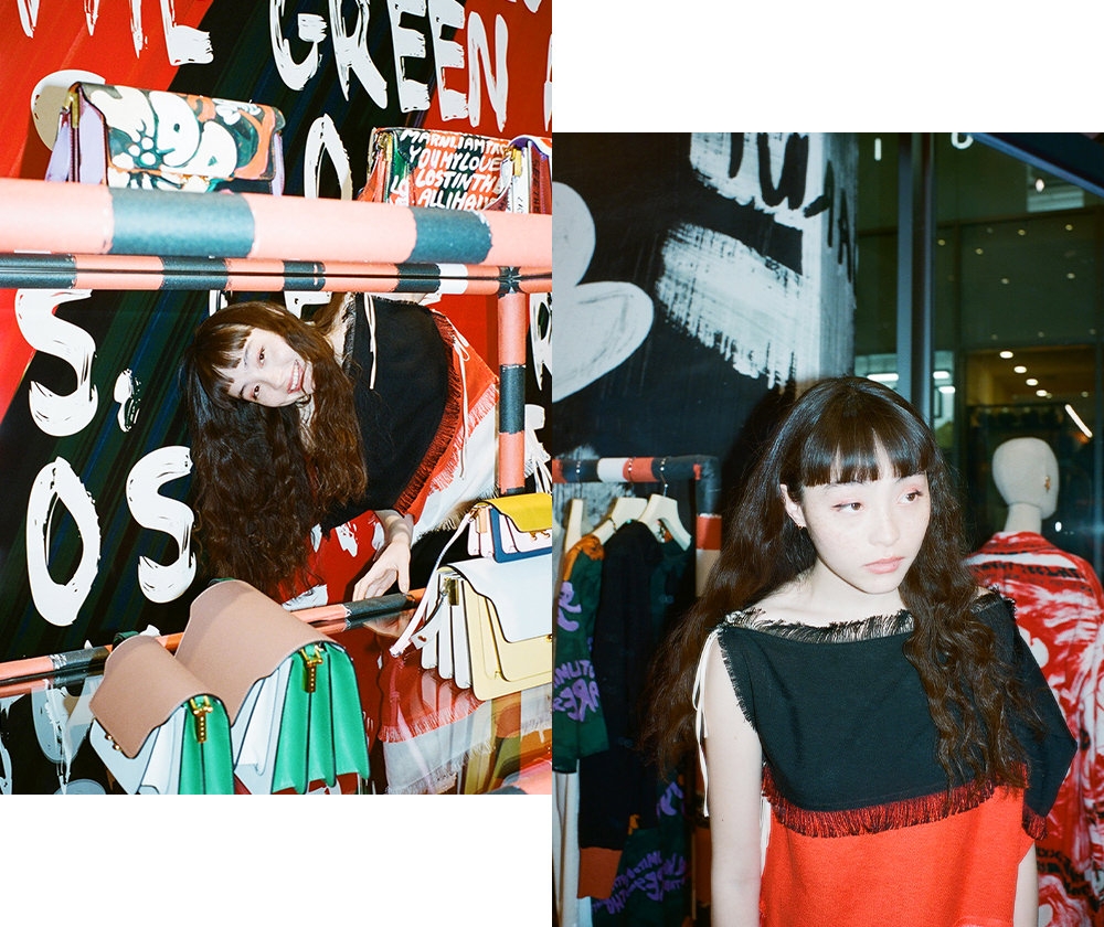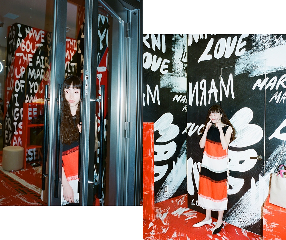 まず注目したいのは、ダイナミックで圧倒される、POP UP SHOPの内装。壁いっぱいに描かれたハンドペイントは、MARNIのクリエイティブ・ディレクター、フランチェスコ・リッソ氏が家族や友人、スタッフに宛てた愛のメッセージなんだとか。コロナ渦中に取り組んだコレクションには、制作の過程で生まれた想いが込められ、感謝の気持ちを手紙にし、そのメッセージをペイントに落とし込んだそう。モトーラさんもエネルギッシュなムードを感じ取り、「この場所に立っているだけでMARNIのクリエイティビティとエネルギーを感じます。パワースポットともいえる空間は、訪れるだけでも元気がもらえそうですね」とコメント。