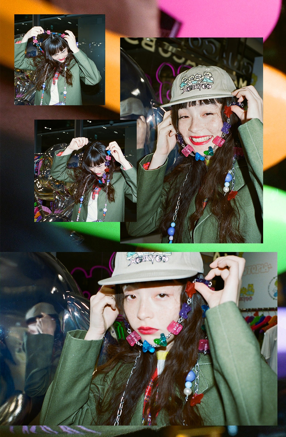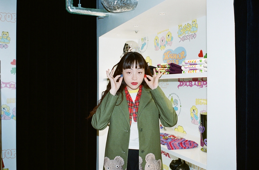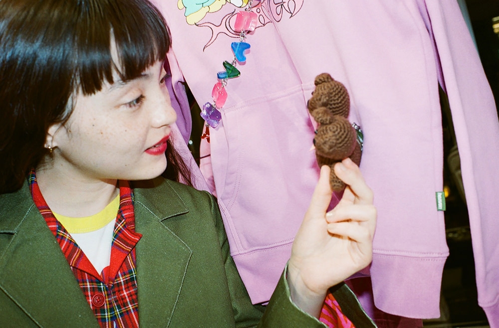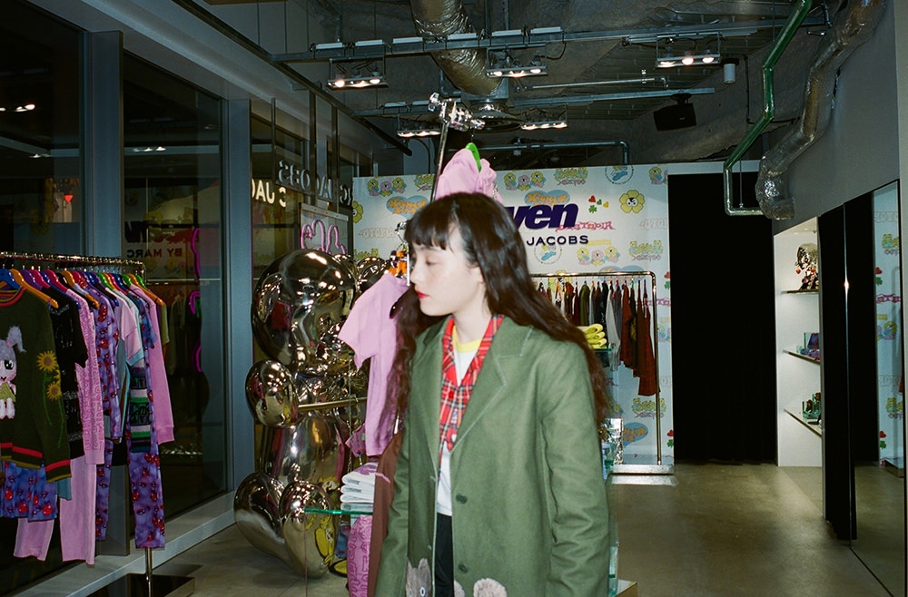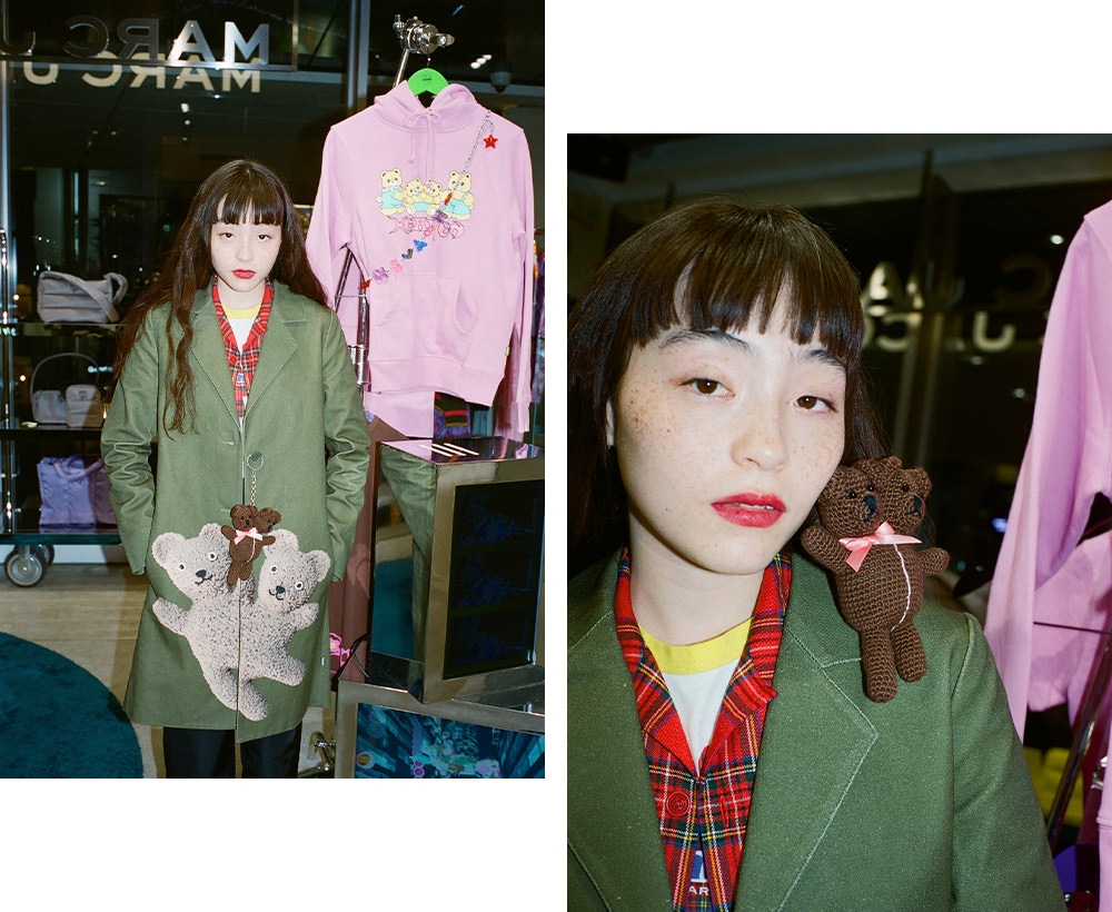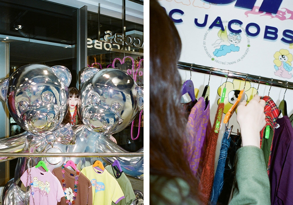 Heaven by Marc Jacobsのスペースには、フォトスポットとしても話題の“ダブルヘッドベア”のネオンサインや、等身大の“ダブルヘッドベア”も併設。ワクワクするような仕掛けにときめきながら、フォトスポットでゆったりと記念撮影も楽しめる。店内でモトーラさんの心を鷲掴みにしたのは、まとうだけで気分が上がるハッピーなウェアコレクションたち。「anccoさん(@ancccoo)の描くキャラクターが大好きなんです。だから、“MUTANT BEARS BABY TEE”は欲しいアイテムのひとつ。ほかにも、柄があしらわれたデニムのセットアップも気になります。セパレートでも着こなせて、様々なシーンで活躍してくれそうな予感」。