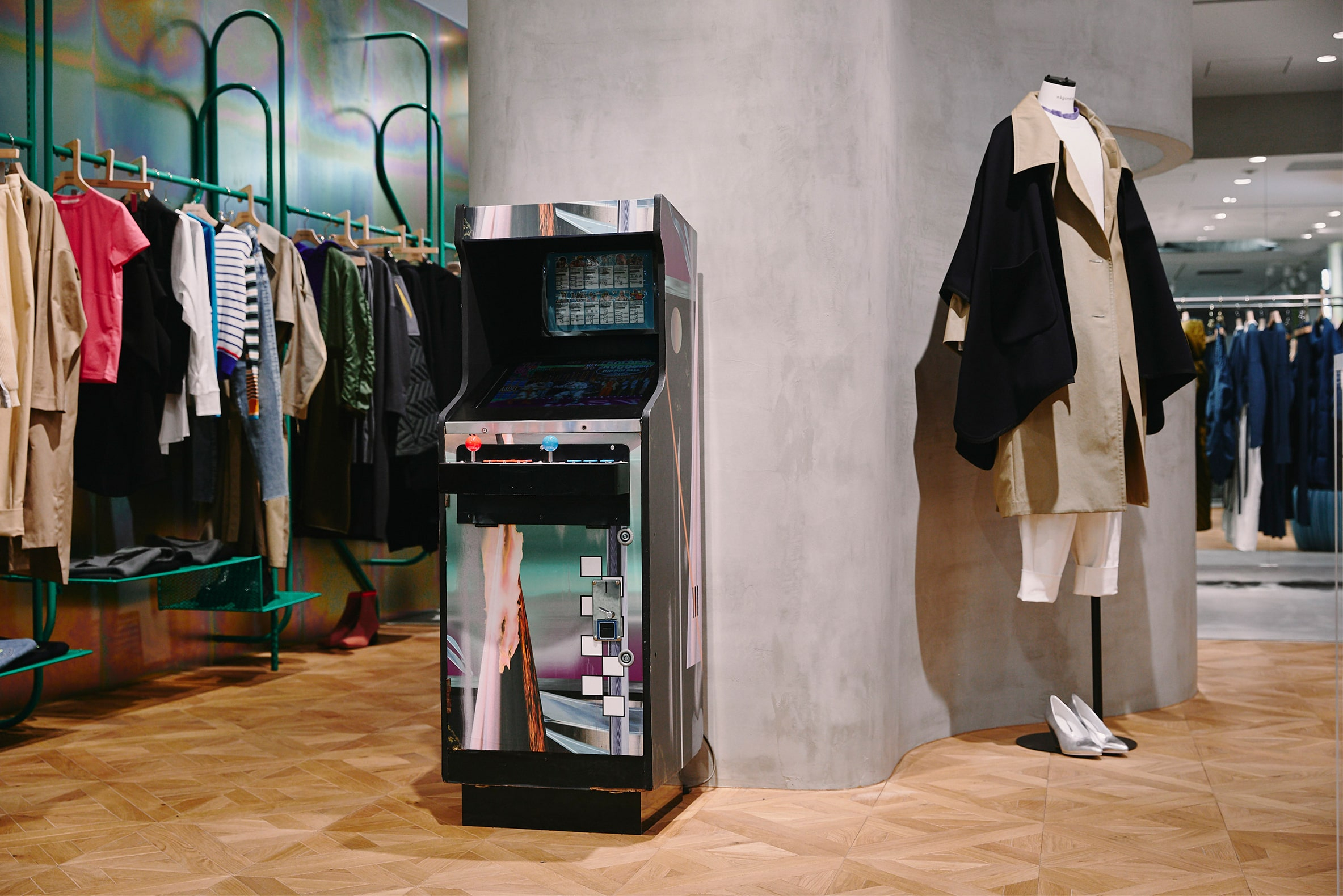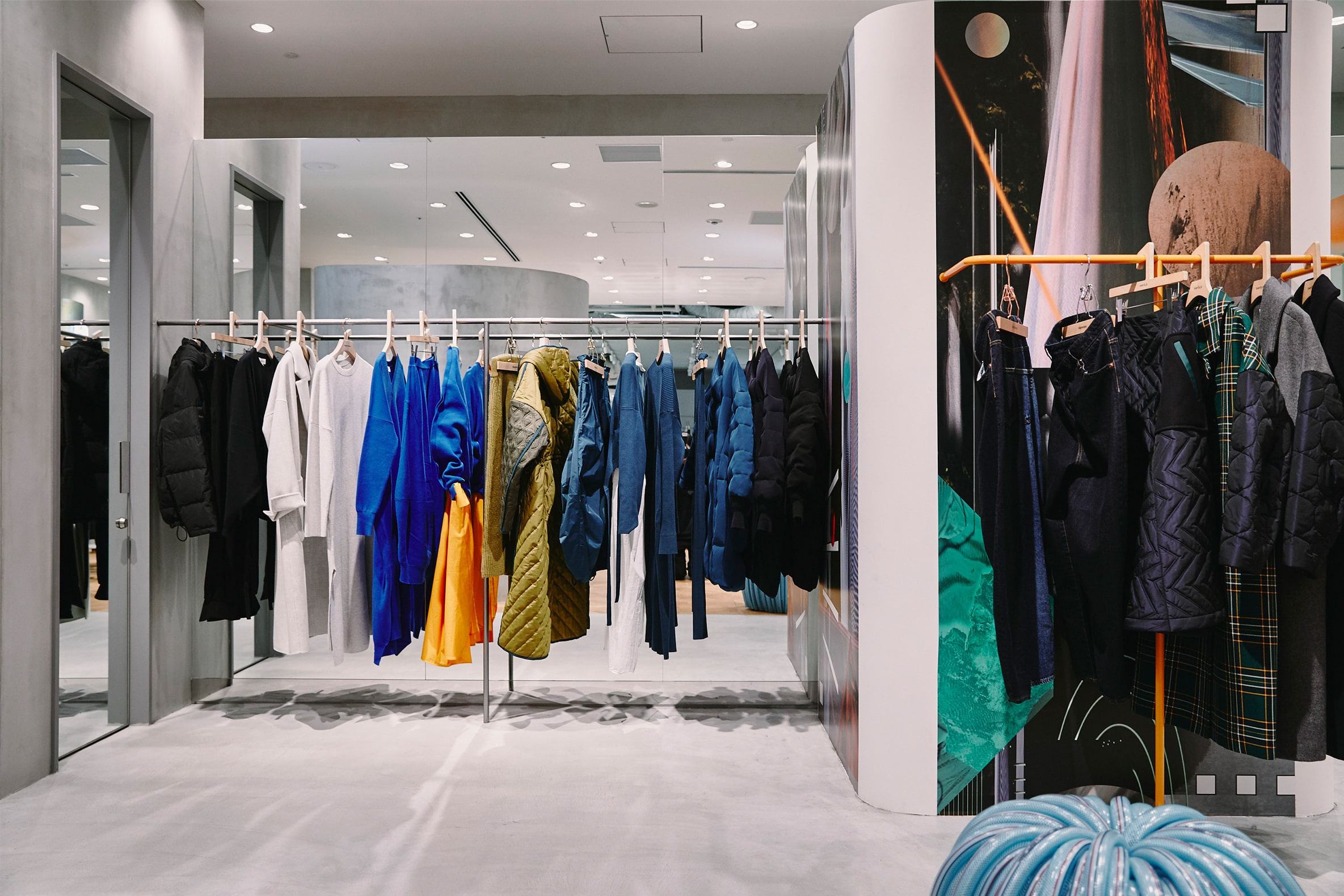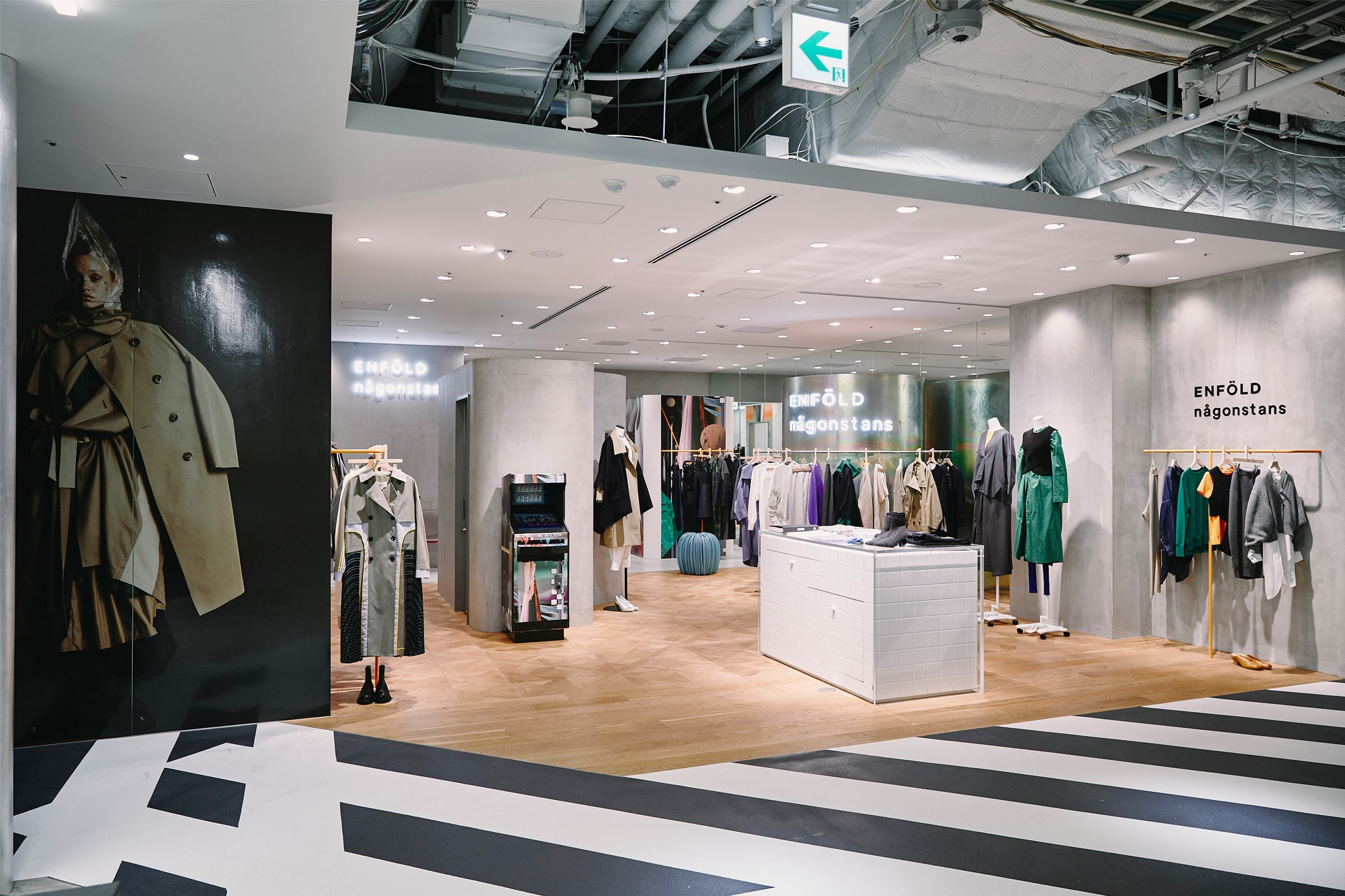 「ENFÖLD/någonstans」の初複合店。内装デザインは“遊び場”をテーマに、アーケードゲーム機やうんてい、ビニールホースで作られたユニークなスツールなどが置かれている。店内のグラフィックアートは、YOSHIROTTEN氏によるもの。