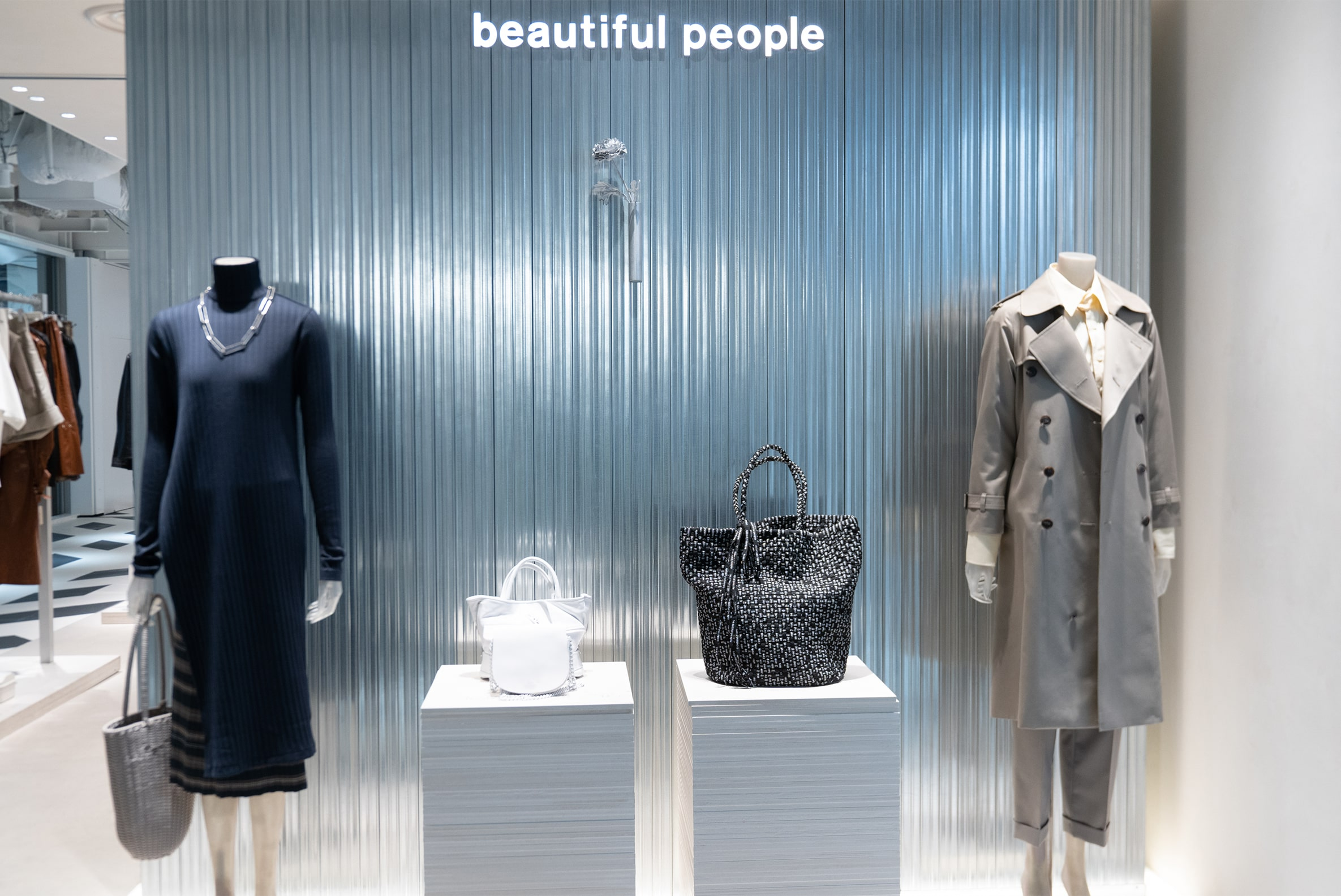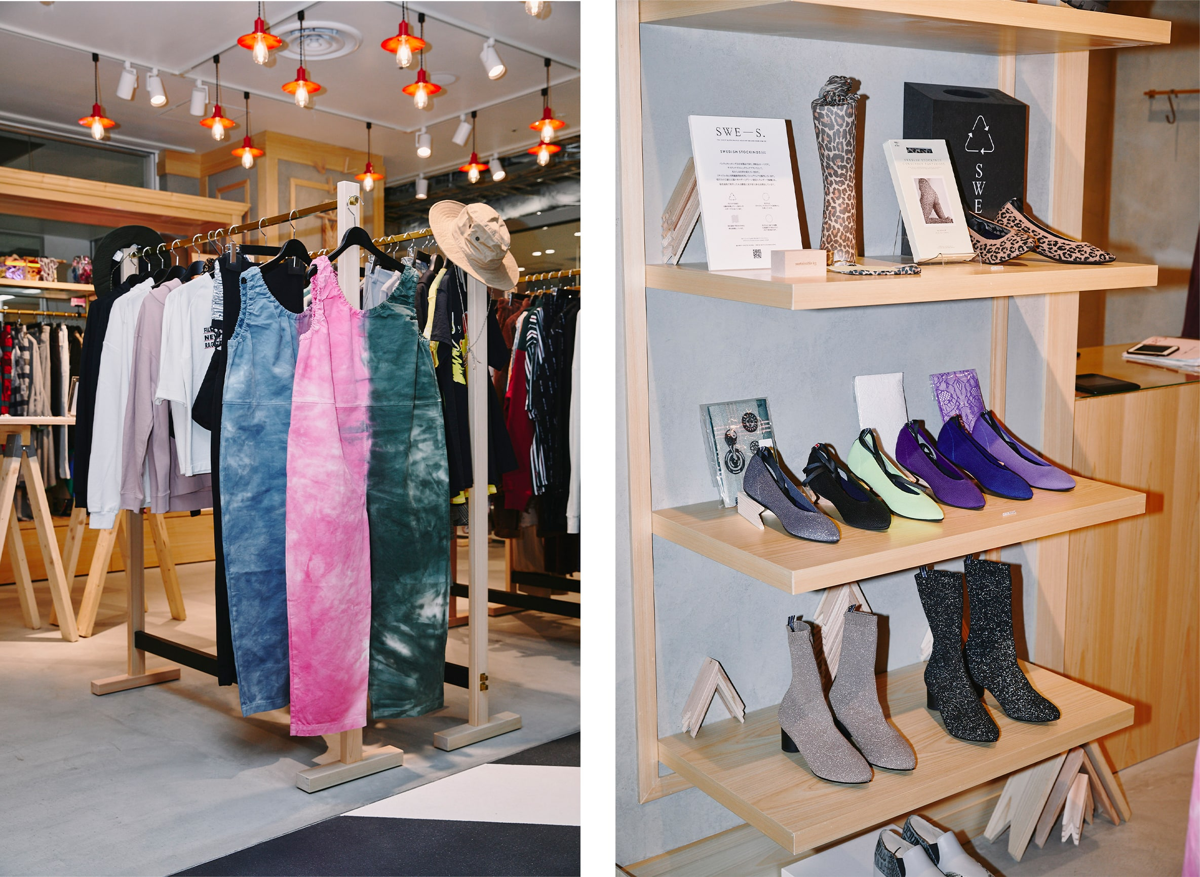 右_サスティナブルシューズブランド「NODO」のシューズは、レザーを一切使用せず、ペットボトルからのリサイクル糸を100%用いたニット甲材の素材使いが特徴。一緒に並んだ「SWEDISH STOCKINGS」のレッグウェアは、リサイクルコットンなどから生み出し、環境負荷の少ない製法で展開。 beautiful people