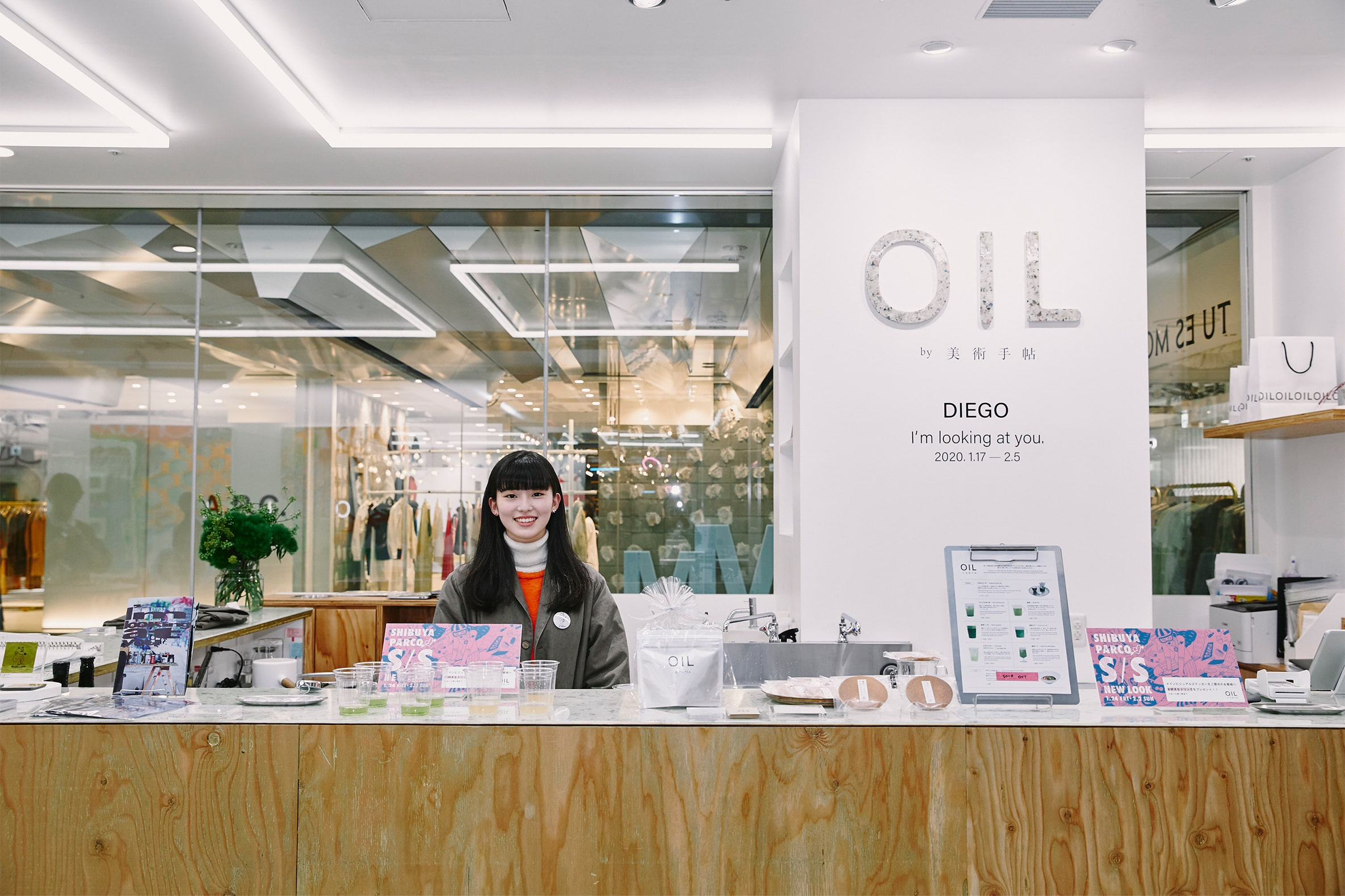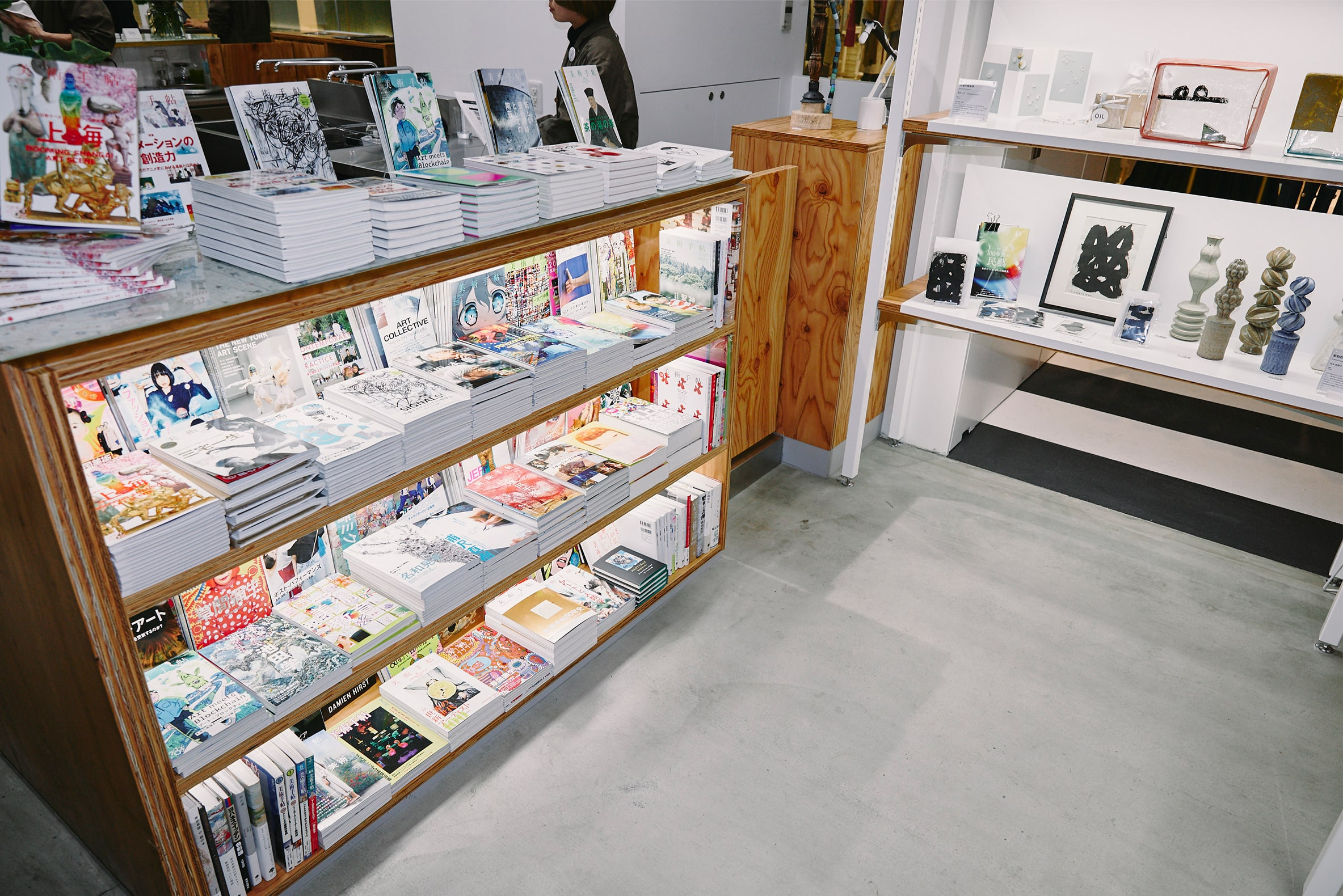 「OIL by 美術手帖」(@oilbybt)では、“室で掛け軸を楽しむように茶を片手にアートに浸ってほしい”をコンセプトに、“GEN GEN AN”(@gen2an)がディレクションを手がけるカフェが併設。物販スペースの一部では、『美術手帖』バックナンバーが並んだり、書籍や写真集が並んだりと、買い物の合間に読書を楽しむことができる。