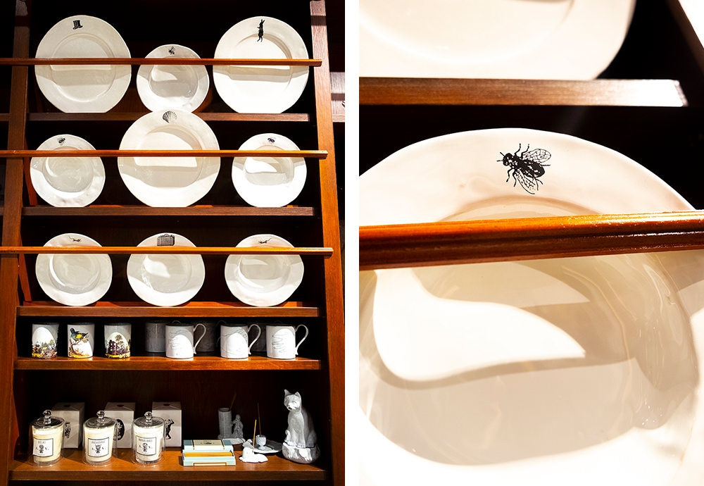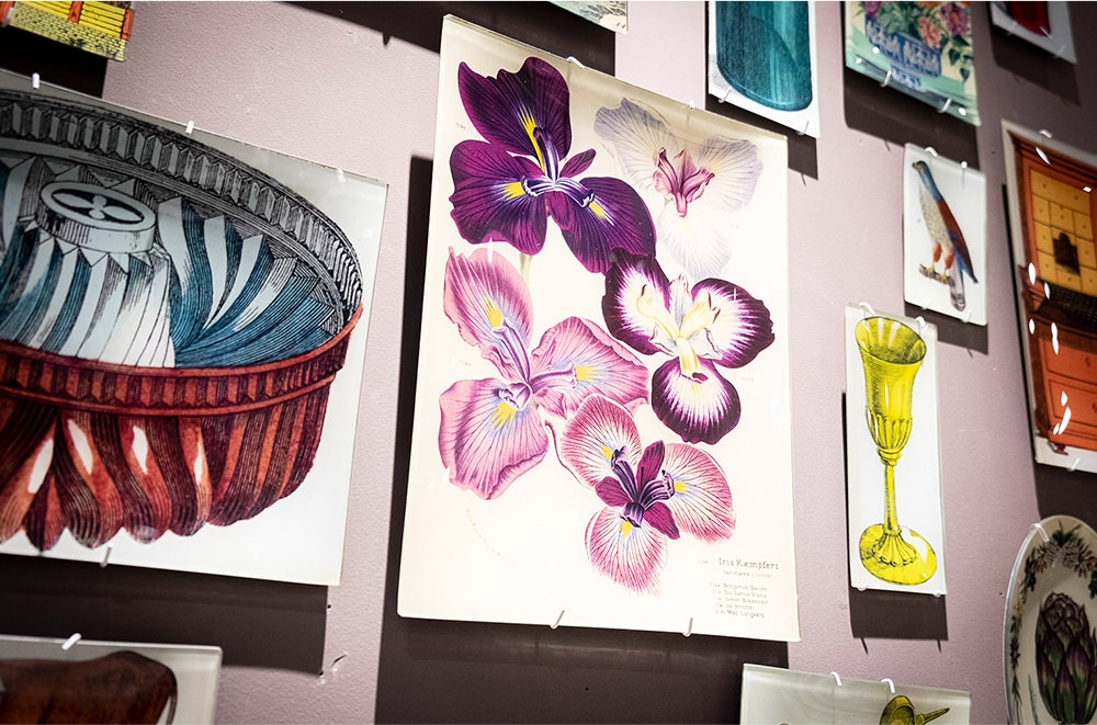 そんな浅野さんがしげしげと眺めていたのは、「JOHN DERIAN(ジョン・デリアン)」のデコパージュプレート。デザイナー自身がコレクションしているヴィンテージの図鑑や雑誌の図柄を、デコパージュという技法を用いてガラスに貼り、一点一点ハンドメイドで制作されている。とりわけ浅野さんが「僕もよく花の絵は描くんですけど、こんなに上手ければなあ……」と見入っていたのは、淡い紫色の蘭の絵をデコパージュしたプレート。