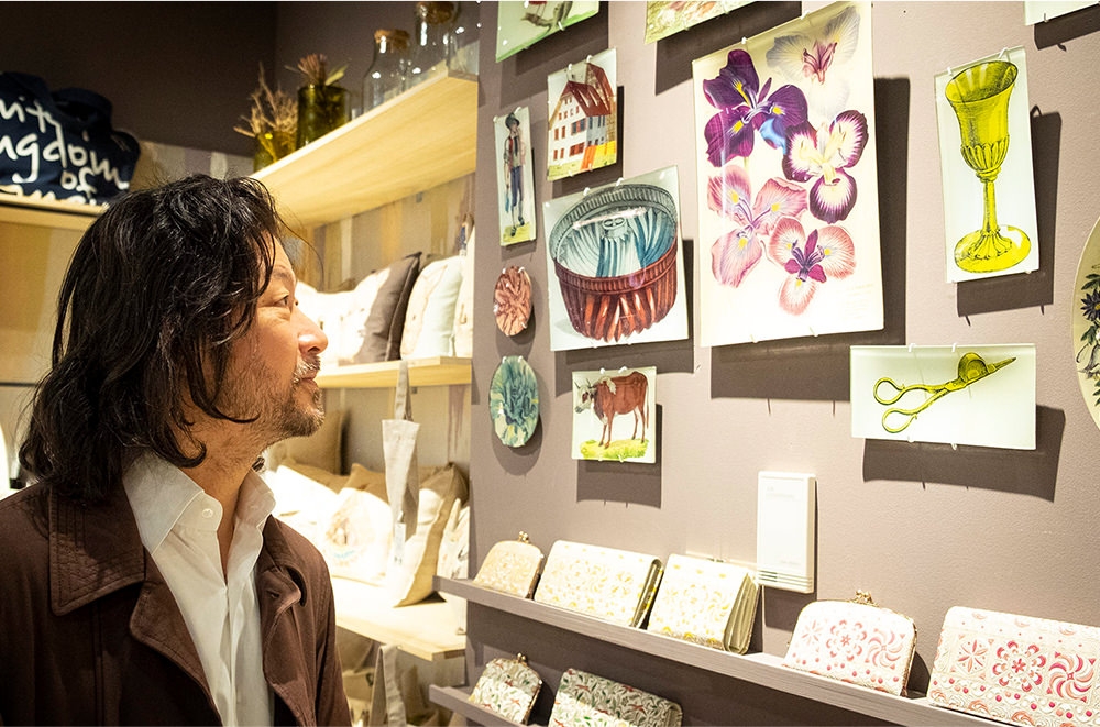 花とアートをこよなく愛する浅野さん。その好奇心を刺激するものが、ショップには他にもたくさん並んでいた。パリ在住のアーティスト・セバスチャンによる手吹きグラス・ブランド「La Soufflerie(ラ・スフルリー)」の花器や、ユーモラスなアートスタンプなどは特にお気に召したようで、店頭スタッフの説明に、真剣に耳を傾けている姿が印象的だった。