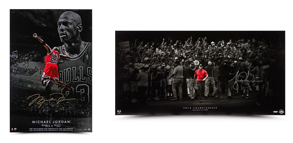 (左)マイケル・ジョーダン直筆サイン入り“MJ ポスター”24×36インチプレミアム・アルミニウムフレーム入り 【世界限定98枚】 予価:¥850,000(右)タイガー・ウッズ直筆サイン入り“ムービング・フォワード・シルバーフォト”36x18インチプレミアム・アルミニウムフレーム入り 予価:¥250,000