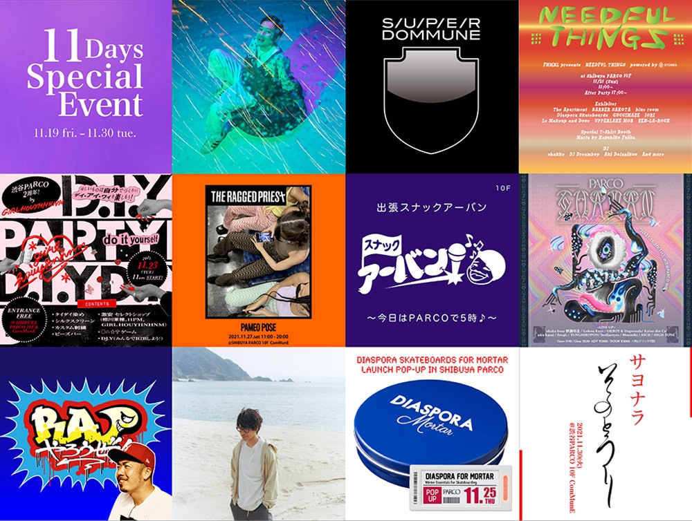 11月19日(金)から11月30日(水)までの期間中、渋谷PARCOならではのカルチャーイベントを開催!世界中で生まれる最先端の音楽やファッションなどいち早く発信するメディア『FNMNL』キュレーションによるフリーマーケットを始め、四谷三丁目の会員制スナック「アーバン」の出張イベント、アーティスト「くるり」結成25周年を記念した岸田繁によるトークイベントなどなど、盛り沢山の内容でアニバーサリーを盛り上げます。