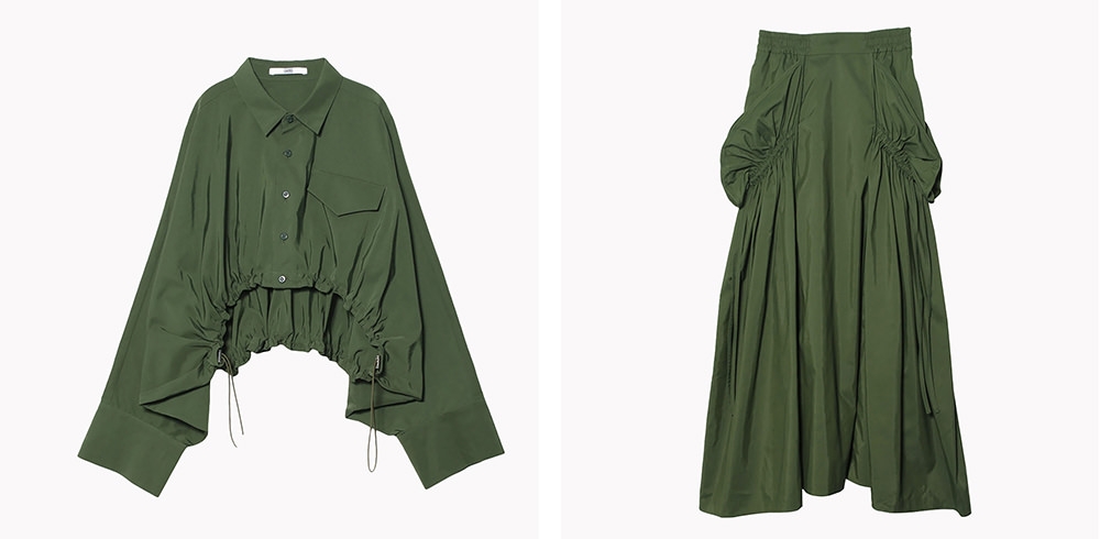 (左)SHORT GATHETR SH BZ ¥29,700、(右)SIDE GATHER VOLUME SK ¥35,200