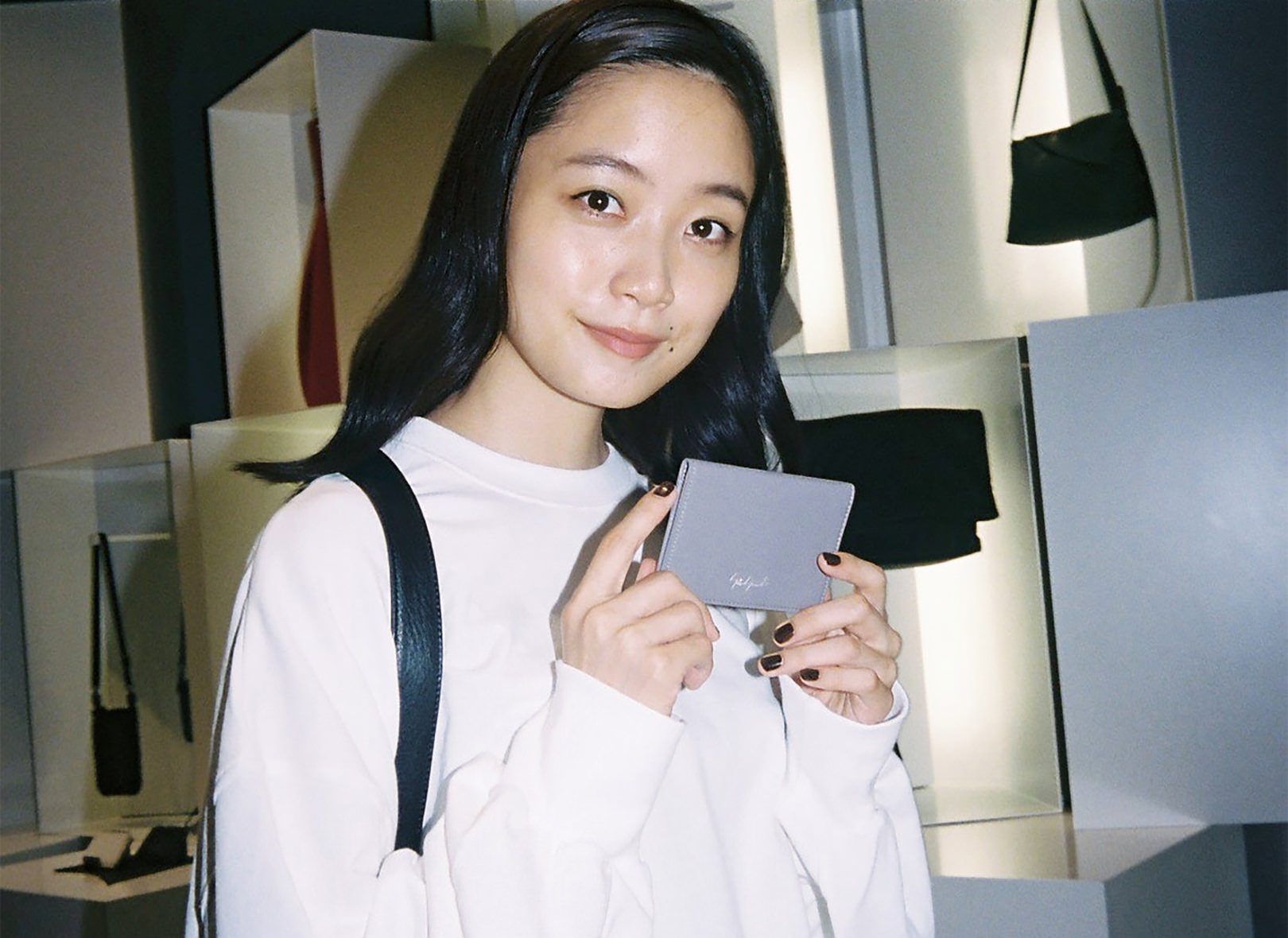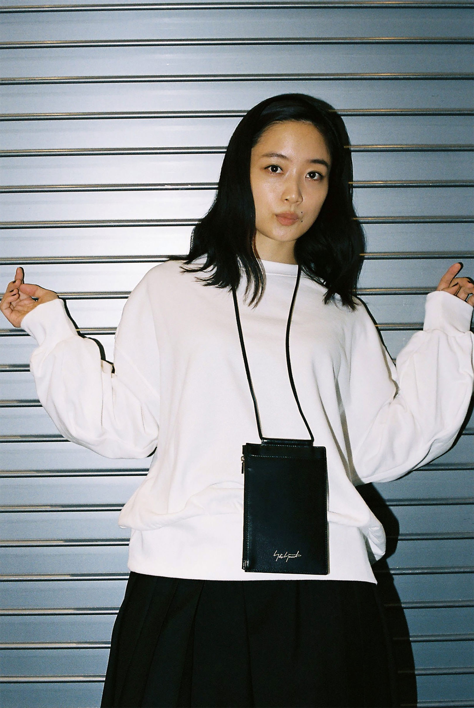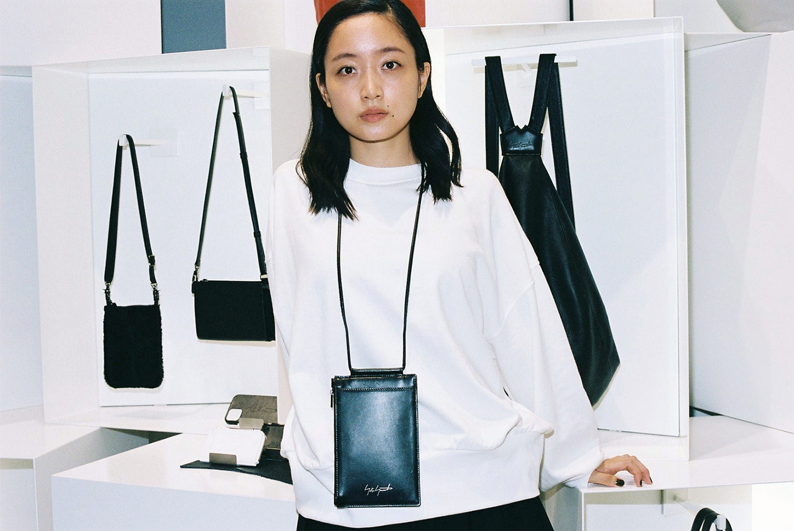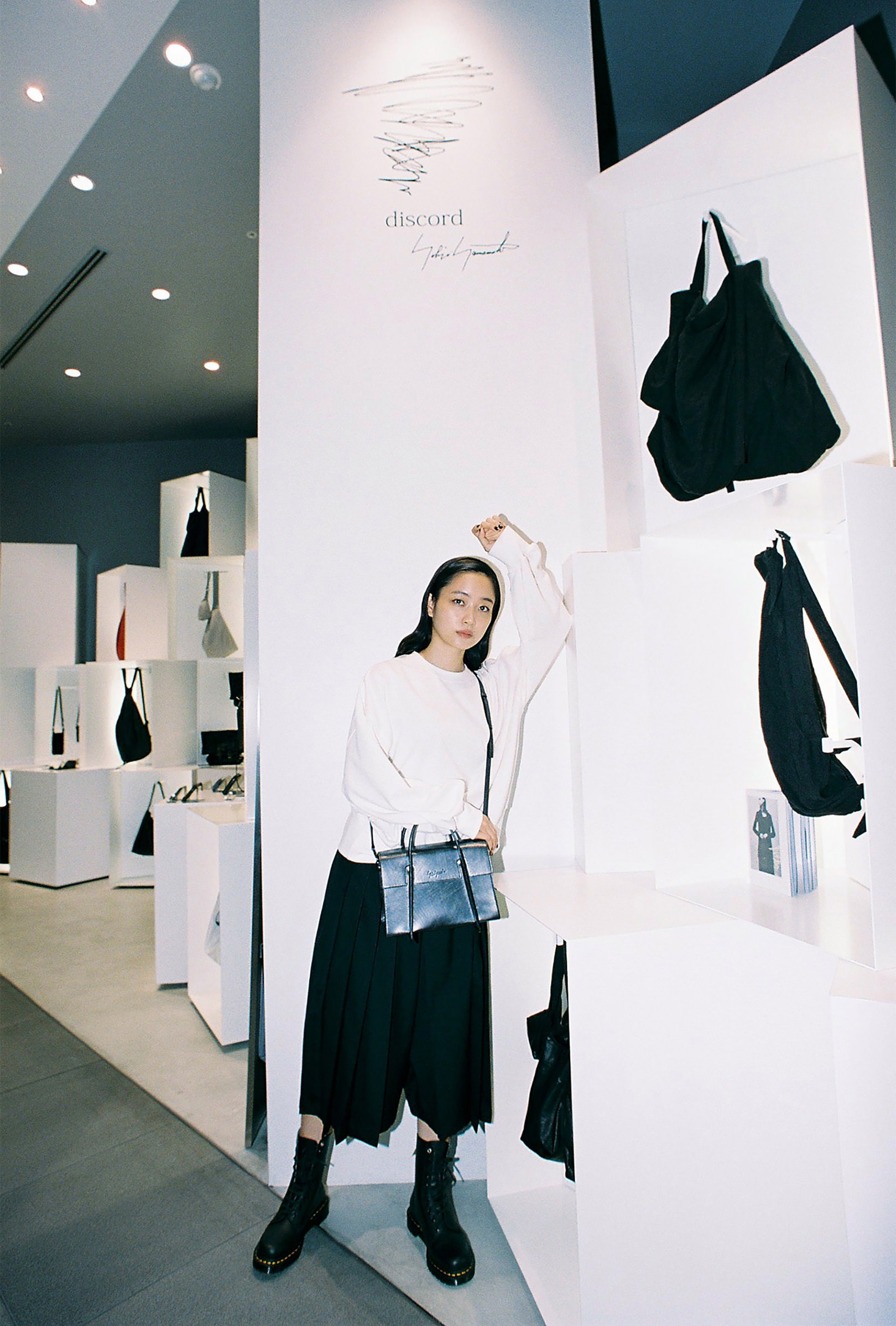 ファッション界の生きる伝説、山本耀司。深川さんにとっては、Yohji Yamamotoが展開する「Ground Y」のキービジュアルを務めたこともあり、憧れであると同時に縁を感じる存在でもある。渋谷PARCO 1Fに SHOPを構える「discord Yohji Yamamoto」は、山本耀司が手がけてきた数々のクリエーションのスパイスを、バッグやアクセサリーコレクションへと落とし込んだブランド。「discord」とは“不協和音”を表し、山本耀司の哲学である、未完成と非対称の美学を象徴している。「プライベートでは、今日のようなモノトーンからカラフルなワンピースまで、さまざまなファッションをします。その分、手にするバッグや靴は、黒が多いですね。シンプルでありながらモードな捻りがあるdiscord Yohji Yamamotoのコレクションは、“唯一無二の黒”だと思います」