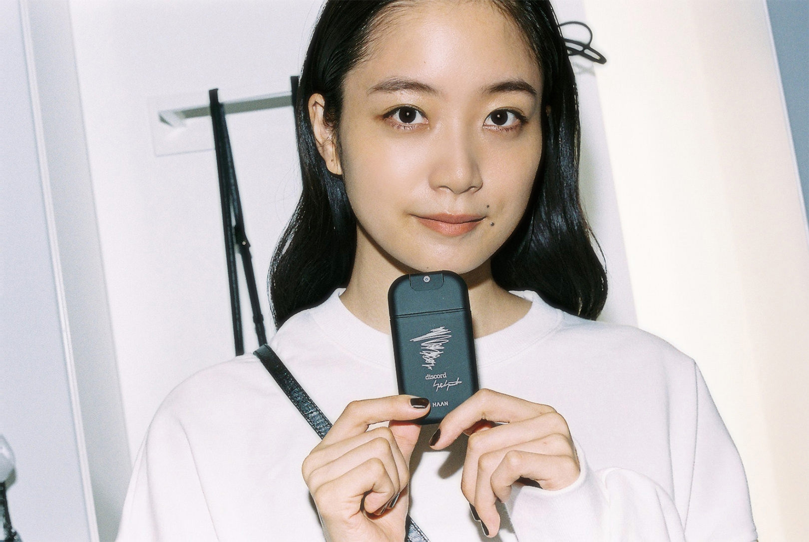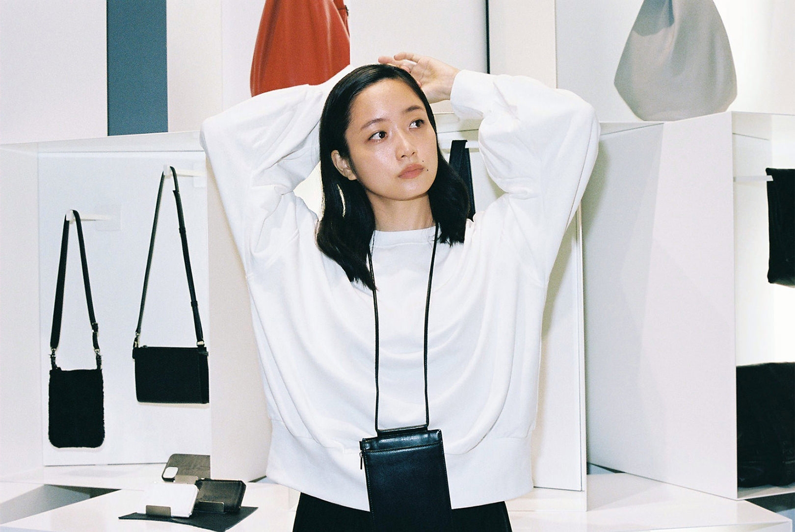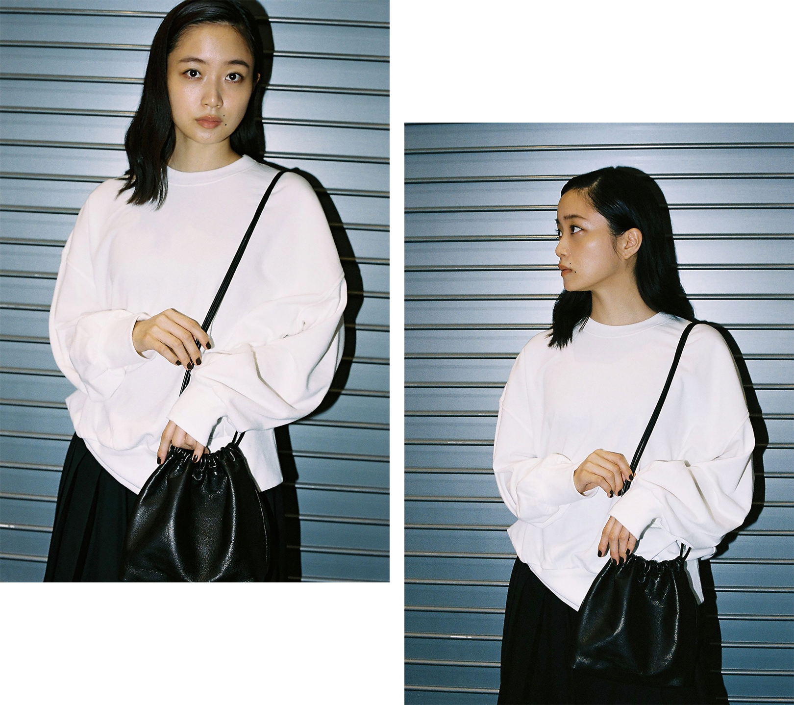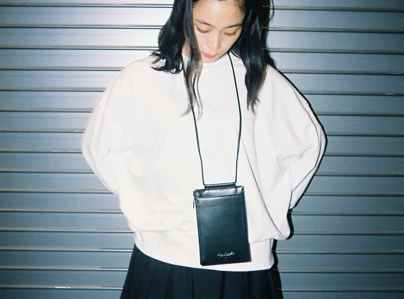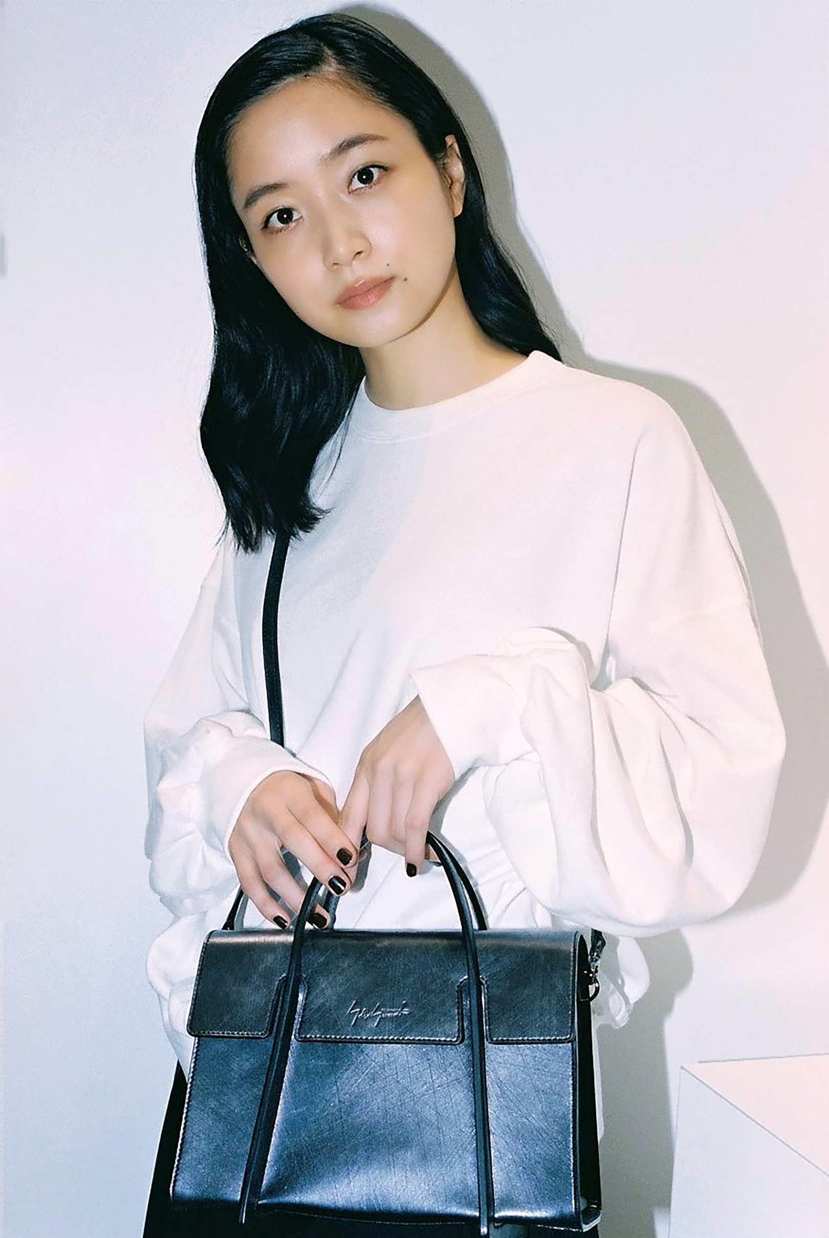 ファッション界の生きる伝説、山本耀司。深川さんにとっては、Yohji Yamamotoが展開する「Ground Y」のキービジュアルを務めたこともあり、憧れであると同時に縁を感じる存在でもある。渋谷PARCO 1Fに SHOPを構える「discord Yohji Yamamoto」は、山本耀司が手がけてきた数々のクリエーションのスパイスを、バッグやアクセサリーコレクションへと落とし込んだブランド。「discord」とは“不協和音”を表し、山本耀司の哲学である、未完成と非対称の美学を象徴している。「プライベートでは、今日のようなモノトーンからカラフルなワンピースまで、さまざまなファッションをします。その分、手にするバッグや靴は、黒が多いですね。シンプルでありながらモードな捻りがあるdiscord Yohji Yamamotoのコレクションは、“唯一無二の黒”だと思います」
