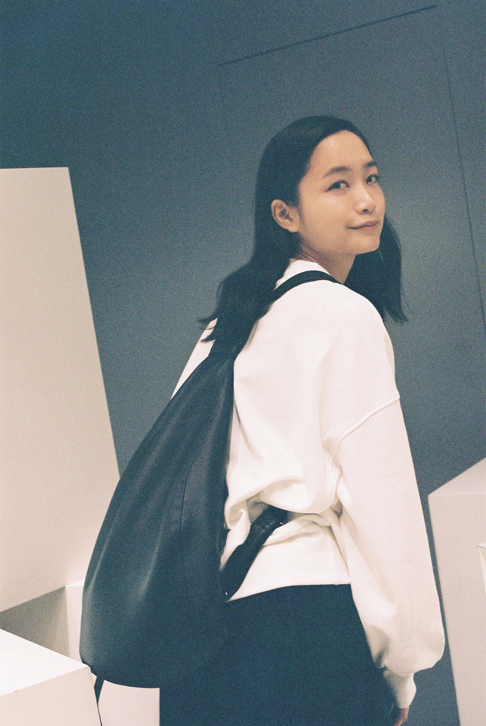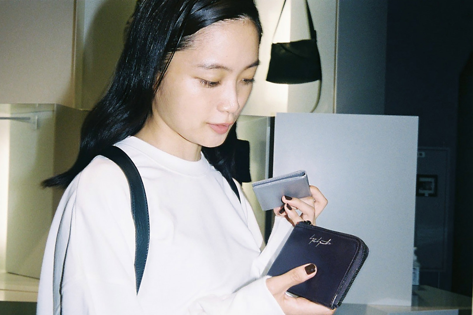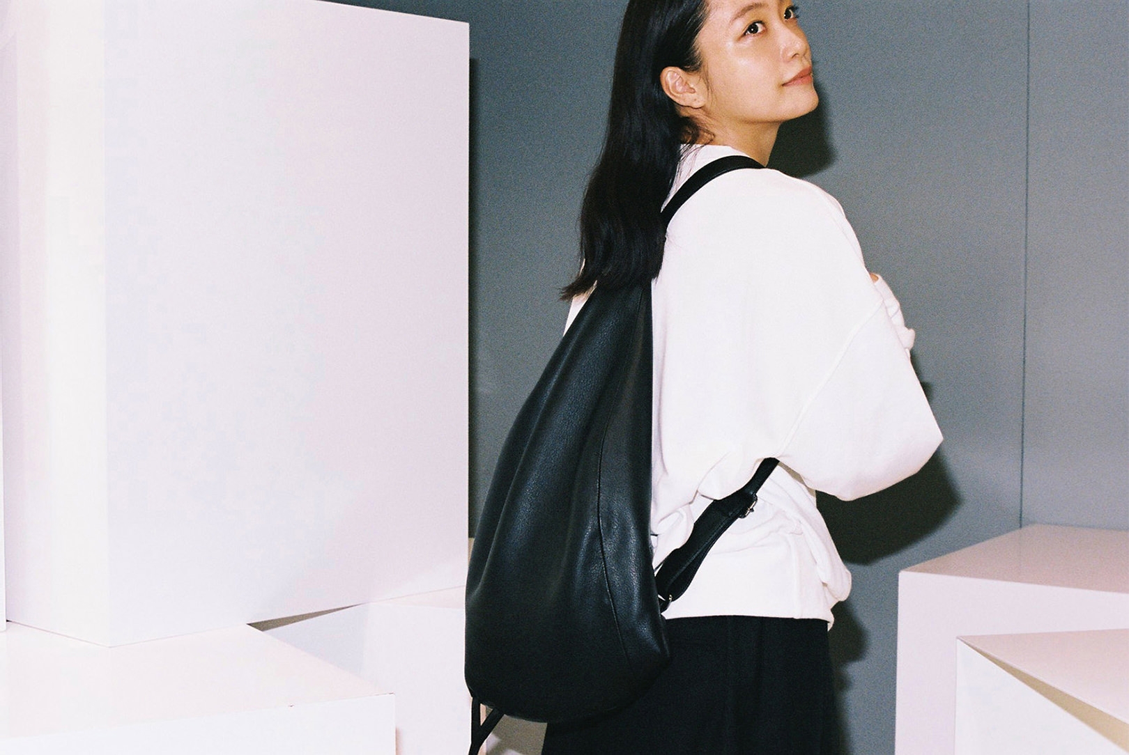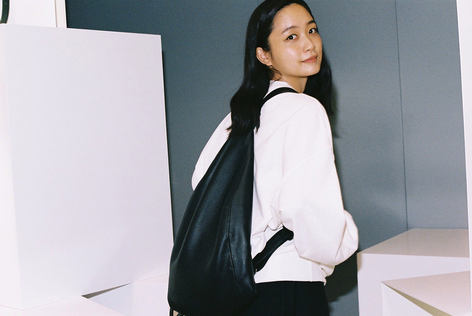 ファッション界の生きる伝説、山本耀司。深川さんにとっては、Yohji Yamamotoが展開する「Ground Y」のキービジュアルを務めたこともあり、憧れであると同時に縁を感じる存在でもある。渋谷PARCO 1Fに SHOPを構える「discord Yohji Yamamoto」は、山本耀司が手がけてきた数々のクリエーションのスパイスを、バッグやアクセサリーコレクションへと落とし込んだブランド。「discord」とは“不協和音”を表し、山本耀司の哲学である、未完成と非対称の美学を象徴している。「プライベートでは、今日のようなモノトーンからカラフルなワンピースまで、さまざまなファッションをします。その分、手にするバッグや靴は、黒が多いですね。シンプルでありながらモードな捻りがあるdiscord Yohji Yamamotoのコレクションは、“唯一無二の黒”だと思います」
