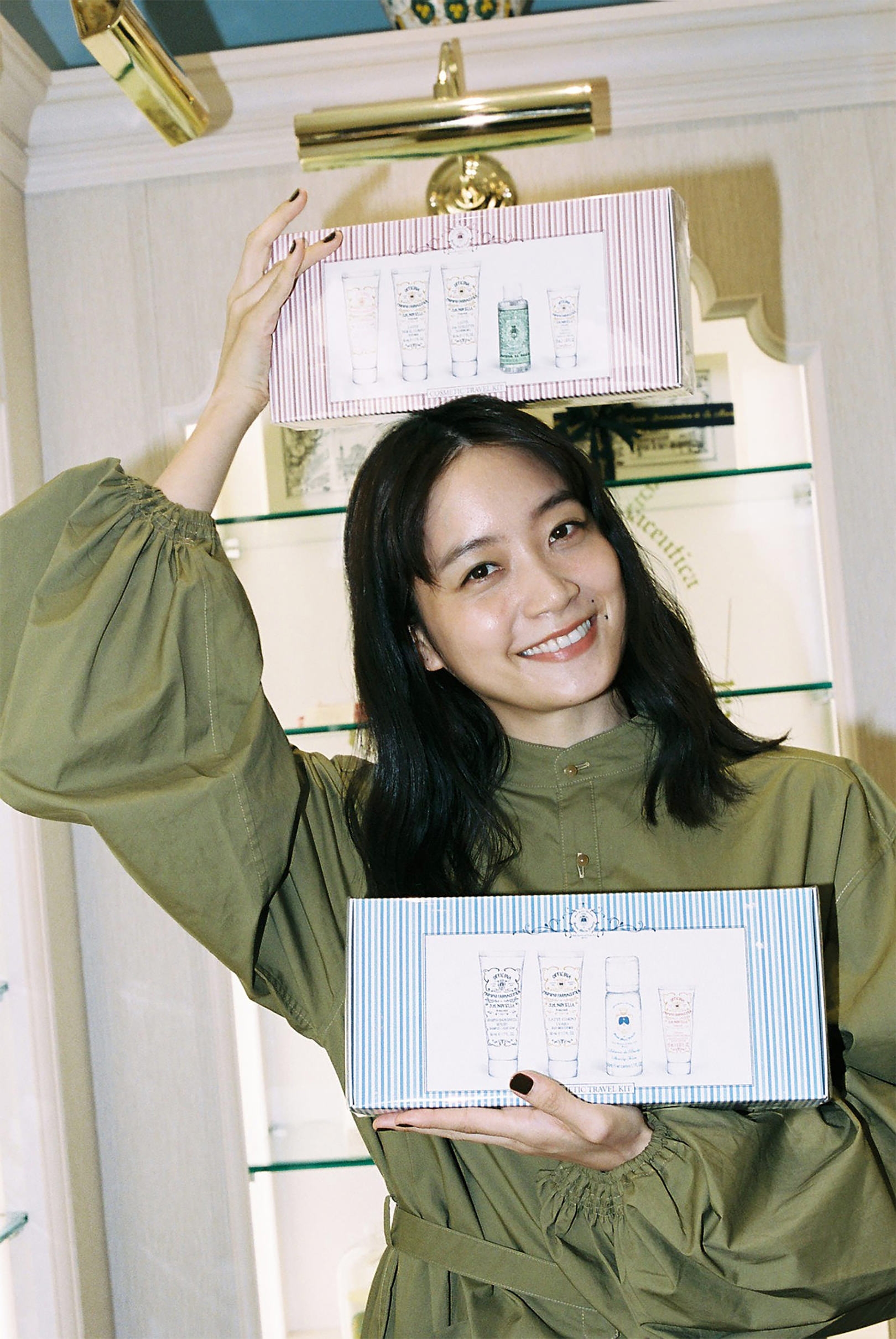 渋谷PARCO 2Fはファッションブランドが多く集結するフロアに位置することもあり、クローゼットに入れて香りを楽しむポプリを購入する人も多いそう。深川さんは、ポプリの葉をハードワックスでタブレット状に固めたタボレッタに興味深々。「6種類ある香りの中で、一番気になるのはラベンダーかな」。ユニセックスで人気のローズウォーターやソープなど、スキンケアも充実。「ソープは以前から気になっていて。スキンケアもぜひトライしてみたい!」。そんな人におすすめなのがトラベルキット。シェービングアイテムをはじめとするメンズ用と、落とすスキンケアから与えるスキンケアまでが揃ったレディース用の2タイプ。ミニサイズながらライン使いでき、Santa Maria Novellaの世界を堪能できる。