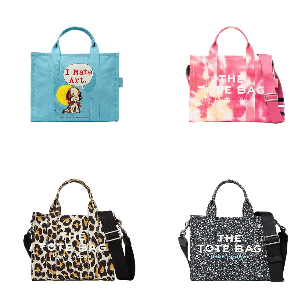 (上)MAGDA ARCHER X THE SMALL TRAVELER TOTE BAG ¥36,300、THE TIE DYE SMALL TRAVELER TOTE BAG ¥36,300(下)THE LEOPARD MINI TRAVELER TOTE BAG ¥30,800、THE DITSY FLORAL MINI TRAVELER TOTE BAG ¥30,800