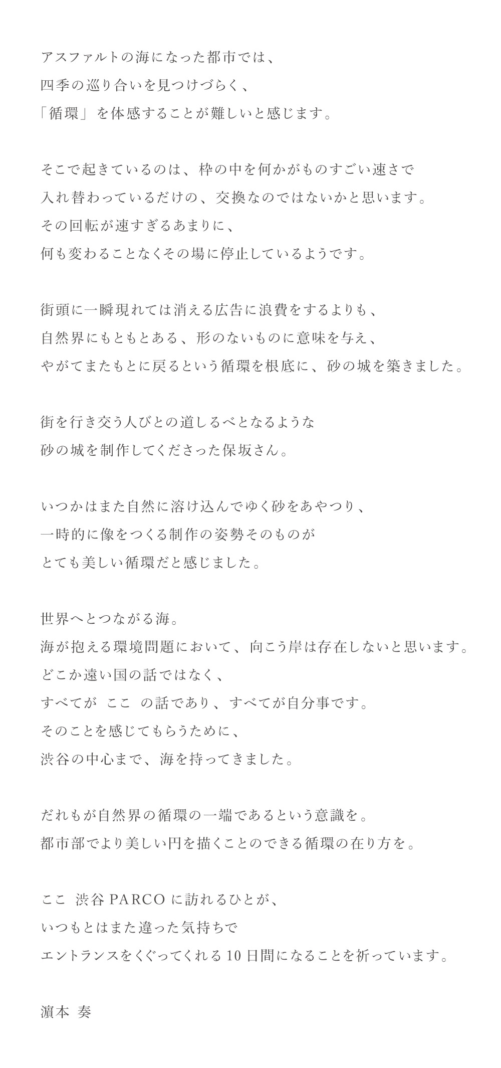 本ビジュアルは「循環」をテーマに、白昼夢のようないつかの記憶を「見たままではない写真」として表現する、フォトグラファー濵本奏を起用。「地球の限りある資源を大切に循環させ、地球の美しい景色と環境を未来に繋げる」を掲げ、砂の彫刻家である保坂俊彦が宮城県東松島市野蒜海岸を舞台に、自然界に存在する物質"砂"と"水"のみで象徴となる「希望の城」を制作した。砂に溶け込みきらめく陽光、揺らぎ瞬く青の水面…自然の移ろいの光景に寄り添いながら、ストーリーが展開される。ロゴデザインは3DCGのオブジェクトを用いたグラフィックを八木幤二郎が担当。