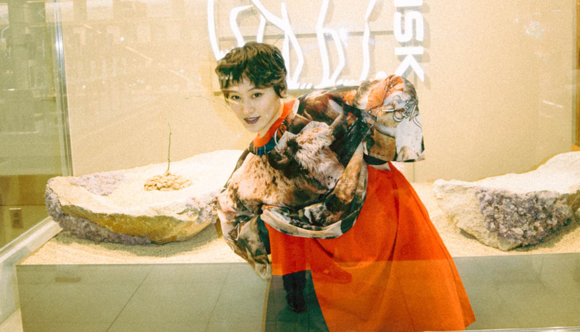 大量生産・大量破棄のこの時代に、「誰かが愛したモノに新たな価値をつけ、未来へ残していく」ことをコンセプトに、ヴィンテージに特化したECショッピングモールとしてサービスをスタートしたVintage Collection Mall(VCM)。2022年2月25日に初のリアル店舗「VCM MARKET BOOTH」を渋谷PARCO 4Fにオープンした。参加ショップは定期的に入れ替わりながら出店される仕組みで、現在はハイブランドのアーカイブを中心に展開する「Hedy」と「mood Tokyo vintage」の2店舗と、バイヤーによる厳選されたヴィンテージアイテムが豊富に揃う「H & JUMPIN’ JAP FLASH」、「dracaena」、「Gleeful」、「HOLIDAY WORKS」の計6店舗。古着を日常的に楽しむコムアイさんに、ヴィンテージの魅力を聞いてみた。「このショートジャケットみたいに、ベルベットに手縫いでひと針づつ丁寧に刺繍が施されているデザインは、現代の大量生産の服では考えられない繊細さ。合わせたブーツは舞台衣装だったそうで、アイテムの背景に宿った物語を知ることもまた楽しいです。面白いデザインやテキスタイルに出会えて、いつも新しい発見があります」