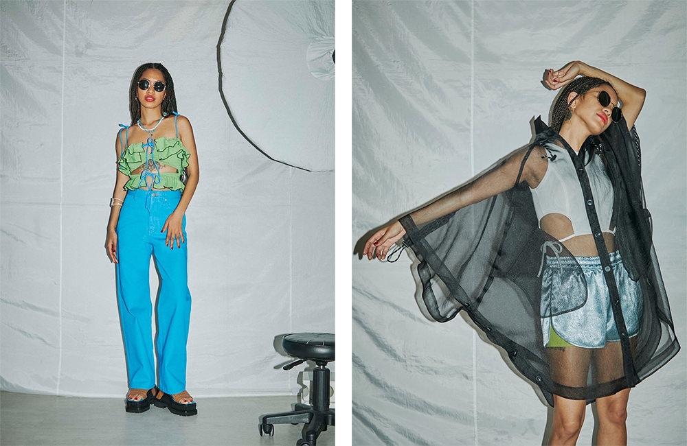 「PAMEO POSE」22SSコレクションから、3年ぶりとなるスイムウェアが登場。大ぶりなフリルが気になる体型までをカバーしてくれる70年代ヴィンテージ風のデザインから、コルセットのようにフェティッシュなフォルムまで、水着としてはもちろん、タウンユースができるアイテムを多彩に揃える。ラインナップには、低身長でもバランスが取りやすい透け感のあるポンチョなども。レトロ&モダンなスタイルは、プールサイドだけでなく、フェスやキャンプでも華やぐ。