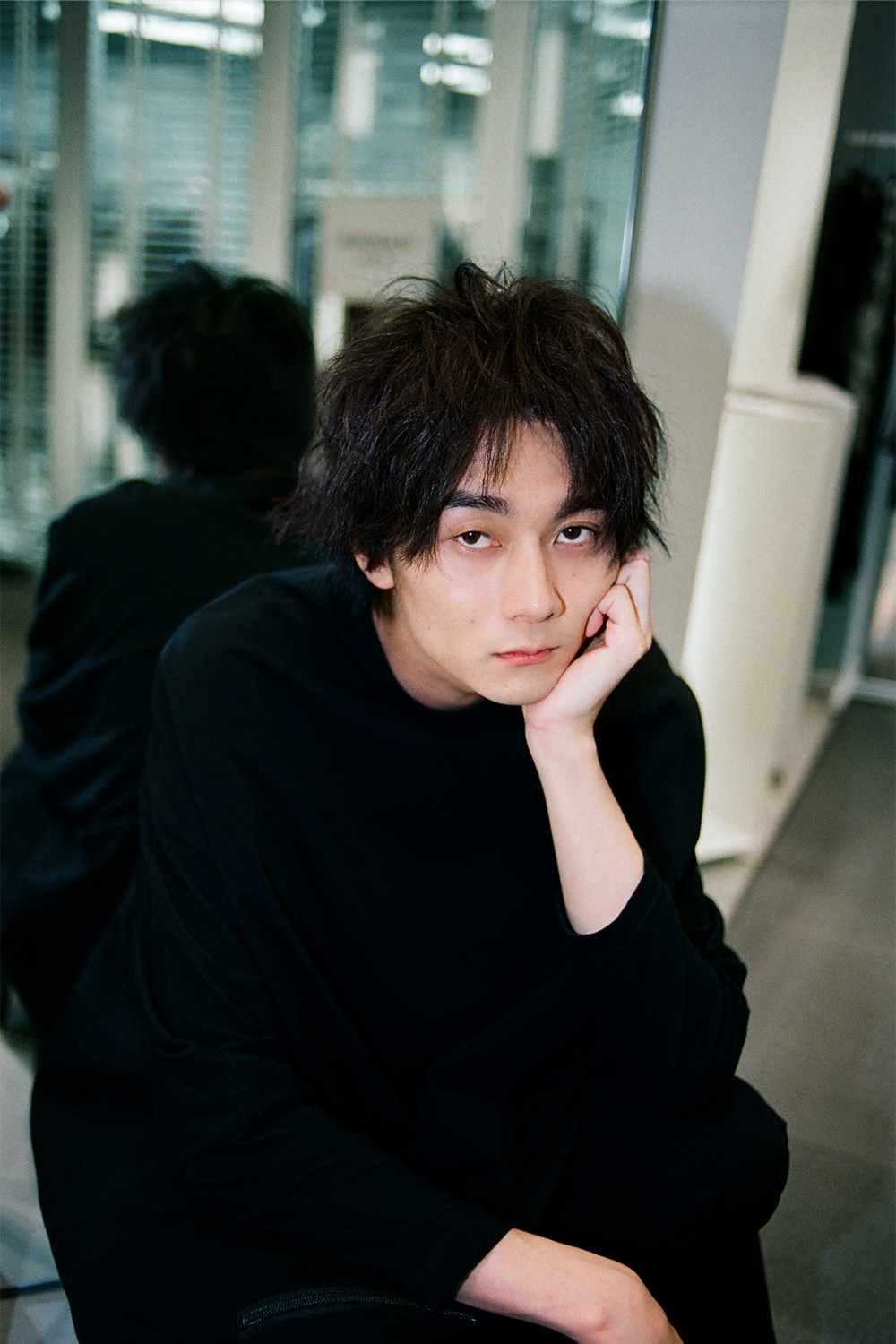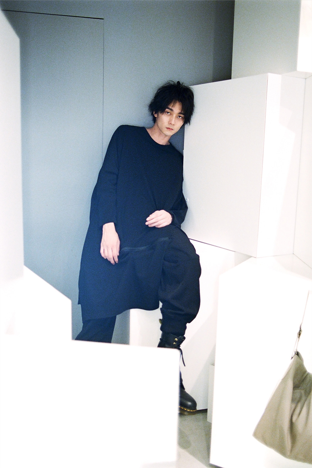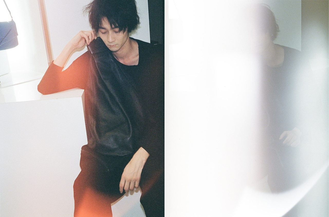 「Ground Y」22SSの新作カットソーやサルエルパンツに身を包んだ栁さんの姿は、黒の力でさらに強い個性を放つ存在に。未完成の美、アシンメトリーなシルエット、ジェンダーレスなパターン——ヨウジヤマモト社のコアをモダンに解釈したアイテムに、やわらかなレザーのショルダーバッグやトートバッグが美しく一体化する。「僕も自分の本質って、何だろうと考えることがよくありますね。これは母親に聞いた話で、幼稚園に物を壊すのが好きな女の子がいたんですよね。みんなで遊んでいる積み木を崩したりとか、その子はよく怒られていたらしいですけど。それを見て、なぜか俺はその子に自分のクーピーを『折っていいよ』って渡したり、不思議なことをしていたみたいです。あとはもうひとつ、昔、母親と神社を歩いていた時にすれ違ったおじさんに『なんだ坊や、不貞腐れた顔して』と言われたことがあって。その時の母親の凄い傷ついた顔を鮮明に覚えています。自分では意識していないですけど、その頃から写真コンプレックスというか、集合写真とかもあんまり写りたくなくなって。だから、今こうやってモデルからスタートしてお芝居をやってるのが真逆というか、不思議ですね。『小さい頃は全然写真に写りたがらなかったのに』って、母親は喜んでます」。