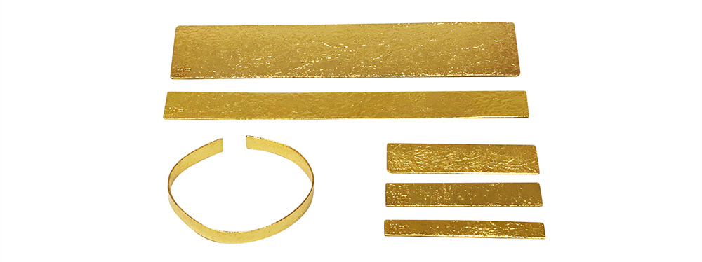 (上から)TIN BREATH 40mm Gold plate ¥12,000+tax、TIN BREATH 20mm Gold plate ¥10,000+tax、TIN BREATH 10mm Gold plate ¥8,000+tax、TIN BREATH Ring 20x80mm Gold plate ¥10,000+tax、TIN BREATH Ring 15x80mm Gold plate ¥8,000+tax、TIN BREATH Ring 10x80mm Gold plate ¥6,000+tax