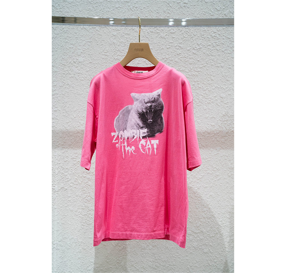 ウィメンズブランドの「FURFUR」からは、男女兼用で着られるユーモラスなキャットプリントTシャツをフィーチャー。既存のベージュとチャコールグレーに加えて、鮮やかなピンクが限定カラーとして仲間入りする。ホラー映画を思わせる「ゾンビキャット」のロゴがパンチを効かせる一枚。ビビッドカラーと相まって、視線を引きつけること間違いなし。オーバーサイズなシルエットなので、女性はメンズライクに着こなしてみて。