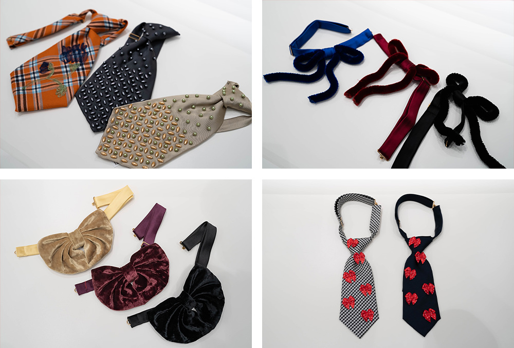 (左上)(左奥から)チェックフラワーショートタイ¥12,000+tax、パールエンブロイダリーショートタイ 各¥18,000+tax(右上)モールリボンボウタイ 各¥8,000+tax