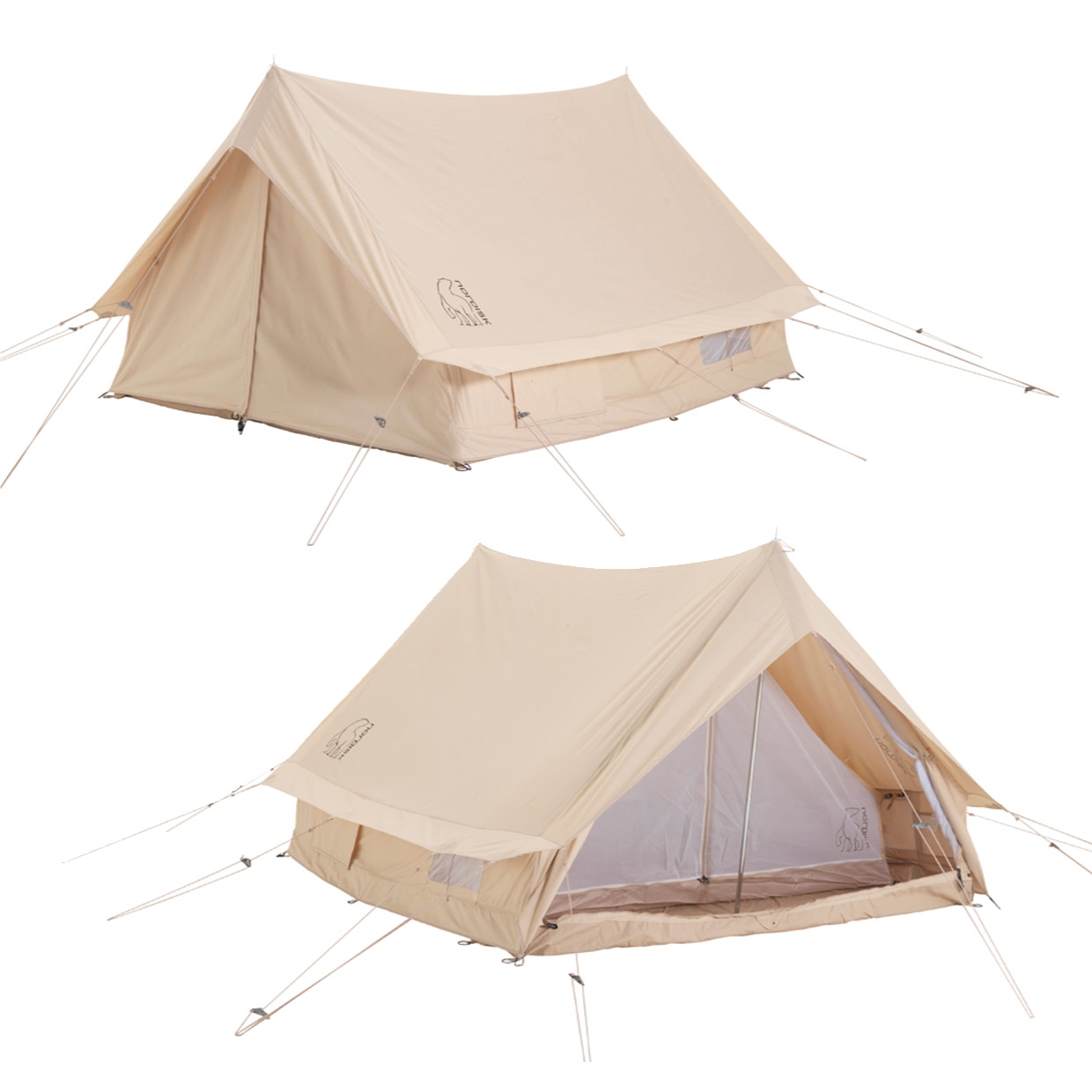 Ydun 5.5は四角いリッジポール設計のテント。4人がゆったりと寝られる広さで、設営も簡単。通気性の良いコットン素材で快適に眠ることができる。両側に出入り口があり出入りも楽々。