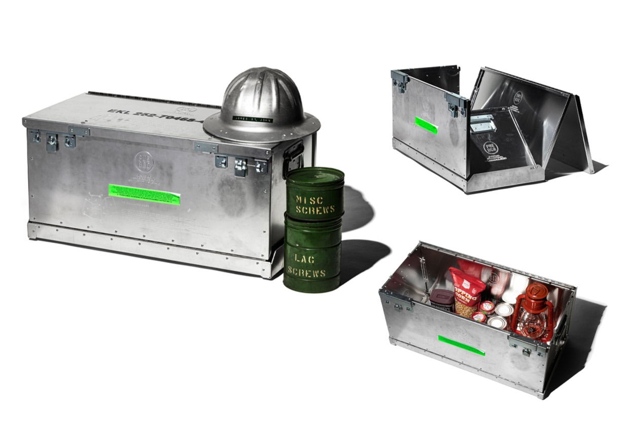 キャンプ道具、防災道具などまとめてすっきり収納できる、アルミ製の折りたたみコンテナ。かつてイギリスの鉄道で貨物を運ぶために使われていたものをベースに、アルミ製で、金属としては軽くて錆びにくいのが特徴。頑丈なのでテーブルとして使用したり、積み重ねたり、アウトドアをはじめ様々なシーンで活躍するアイテム。折りたたむと厚さ6cmになるので、使わない時はコンパクトに収納でき、使用する時にはさっと組み立てられる。