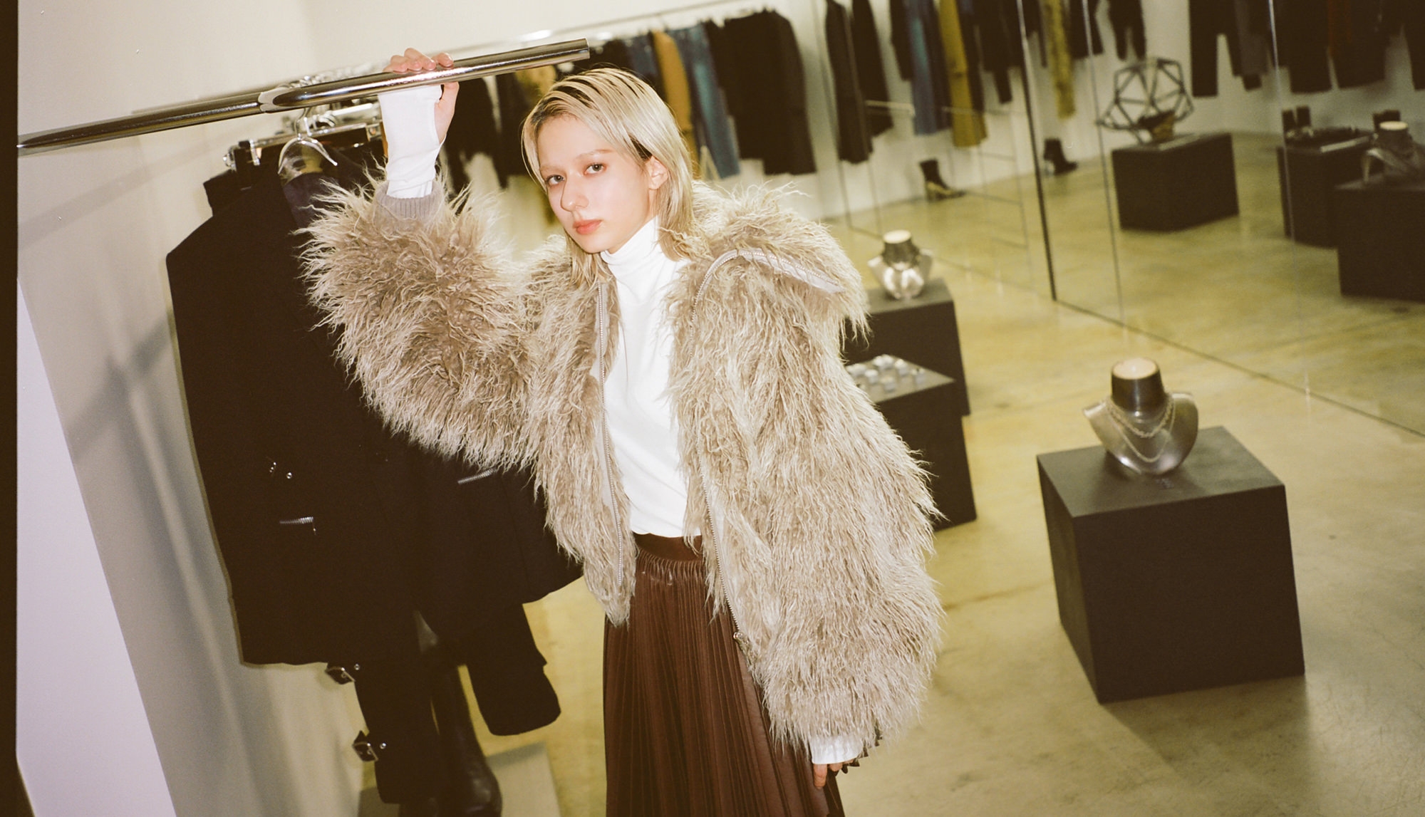 PAMEO POSE 2022 AWコレクションのテーマは「META LADY」。強く気高いメタ(高次)な“貴婦人”をインスピレーションに、ゴシックでロマンティックな世界観を表現している。最高にメタな貴婦人 マリー・アントワネットや優雅に微笑む空想上の貴婦人など、十人十色のMETA LADYがプリントされたアイテムを、クラシカルかつパンキッシュ、フェミニンとマニッシュの二面性を持つ「PAMEO POSE」らしいスタイリングとして提案。90年代を想わせるリボン結びのシースルーブラウスを纏った友沢こたおさんは、まさに高次な貴婦人(META LADY)そのもの。「普段の私のファッションは原始人みたいな感じなんですけれども(笑)、服は結構好きですね。触った感じの質感とか、シンプルだけれども強い感じとか、面白い柄とかが好き。PAMEO POSEが打ち出す世界観や雰囲気にすごく憧れがあって。インスタとかを見ながら、『めちゃくちゃ可愛い、いつか着てみたい!』って思っていた洋服なんです」