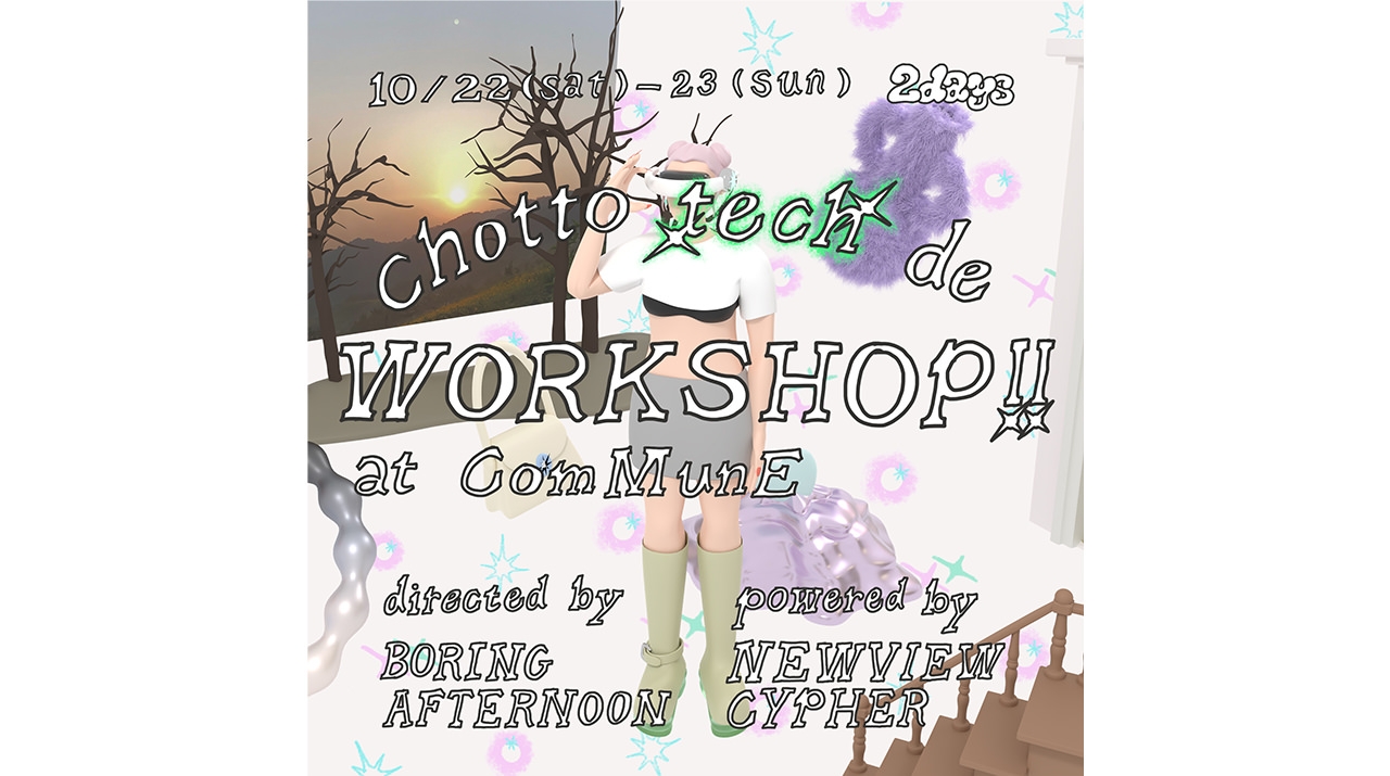 BORING AFTERNOON企画による"chotto tech de WORKSHOP!!" at ComMunE。様々なジャンルで活躍するアーティストの方々とXRアートコレクティヴNEWVIEW CYPHERのコラボレーションが実現!2daysにわたりワークショップから占いまで。日常にちょっとtechなきっかけを。詳細はこちらにて随時公開。