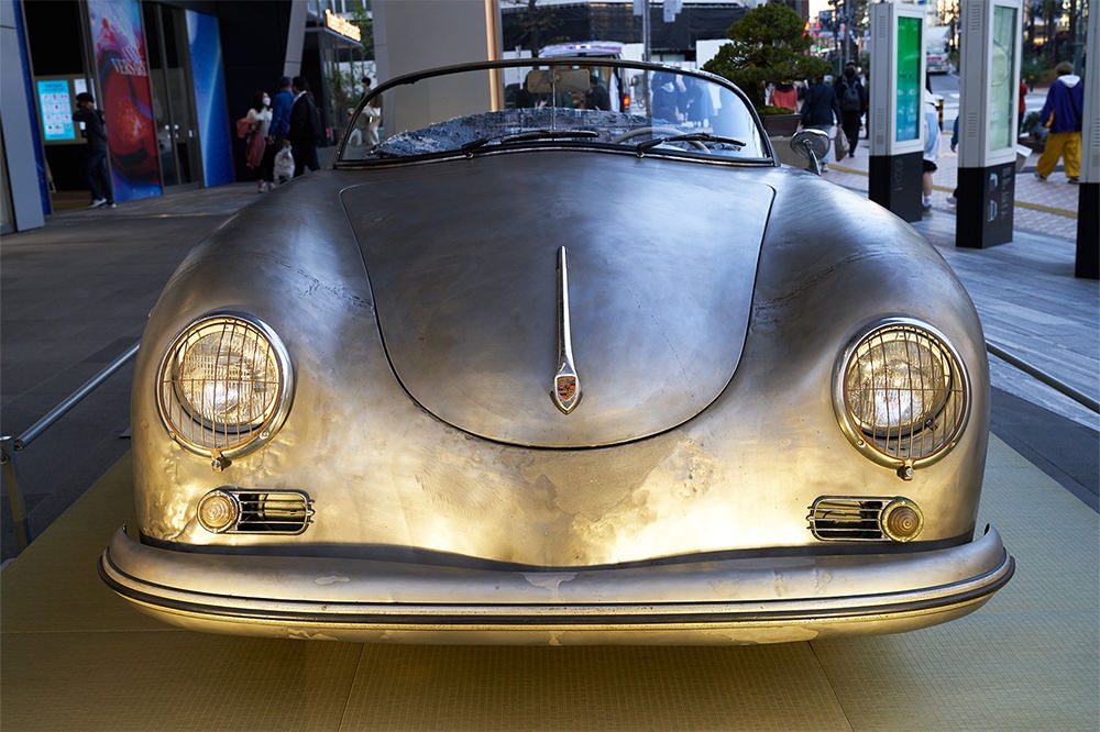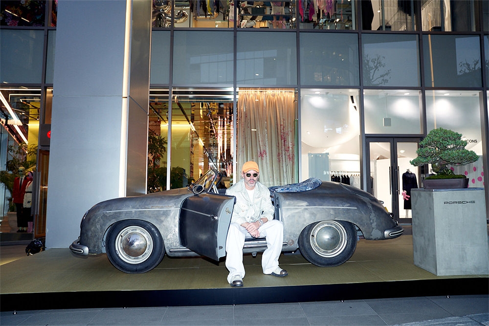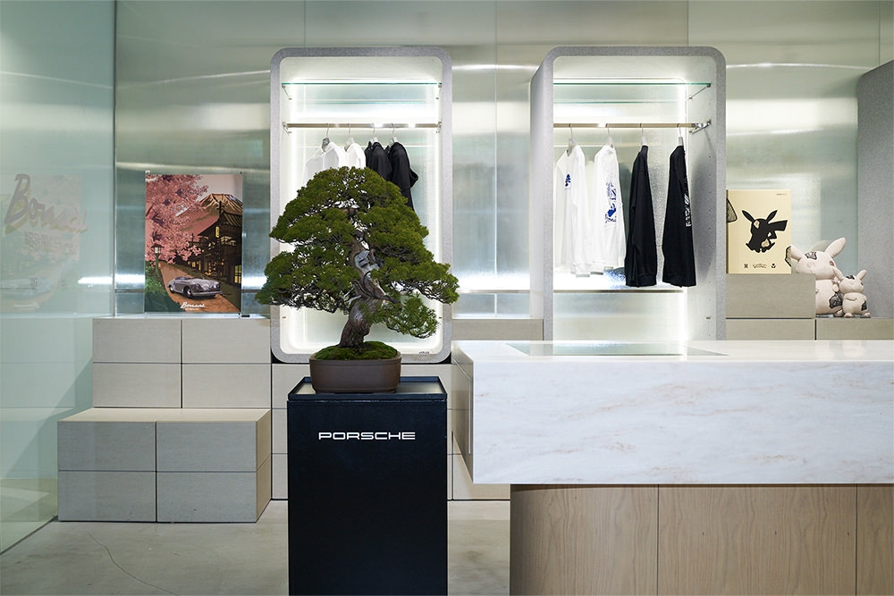 現代アーティストDaniel Arshamが、日本の美意識のひとつとされる“わびさび”にインスパイアされ、1955年製Porsche 356 Speedstarをカスタムした“Bonsai”をエントランスに展示。今回の“Bonsai 356”では車の製造の歴史に寄り添いながら、経年変化や摩耗を明らかにするために約2年を要したという。また、「Arsham Studio」×「Porsche」コラボアイテムは「2G POPUP STUDIO」にて展開された。