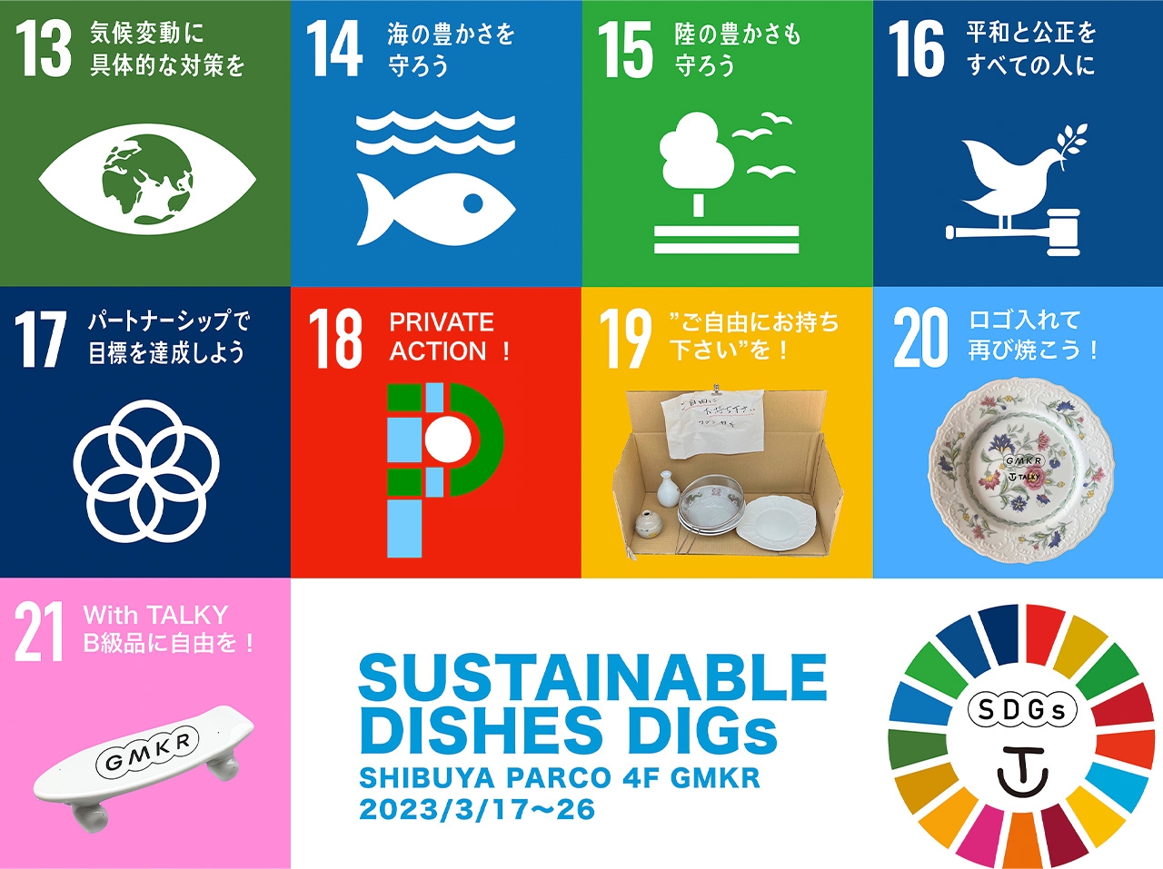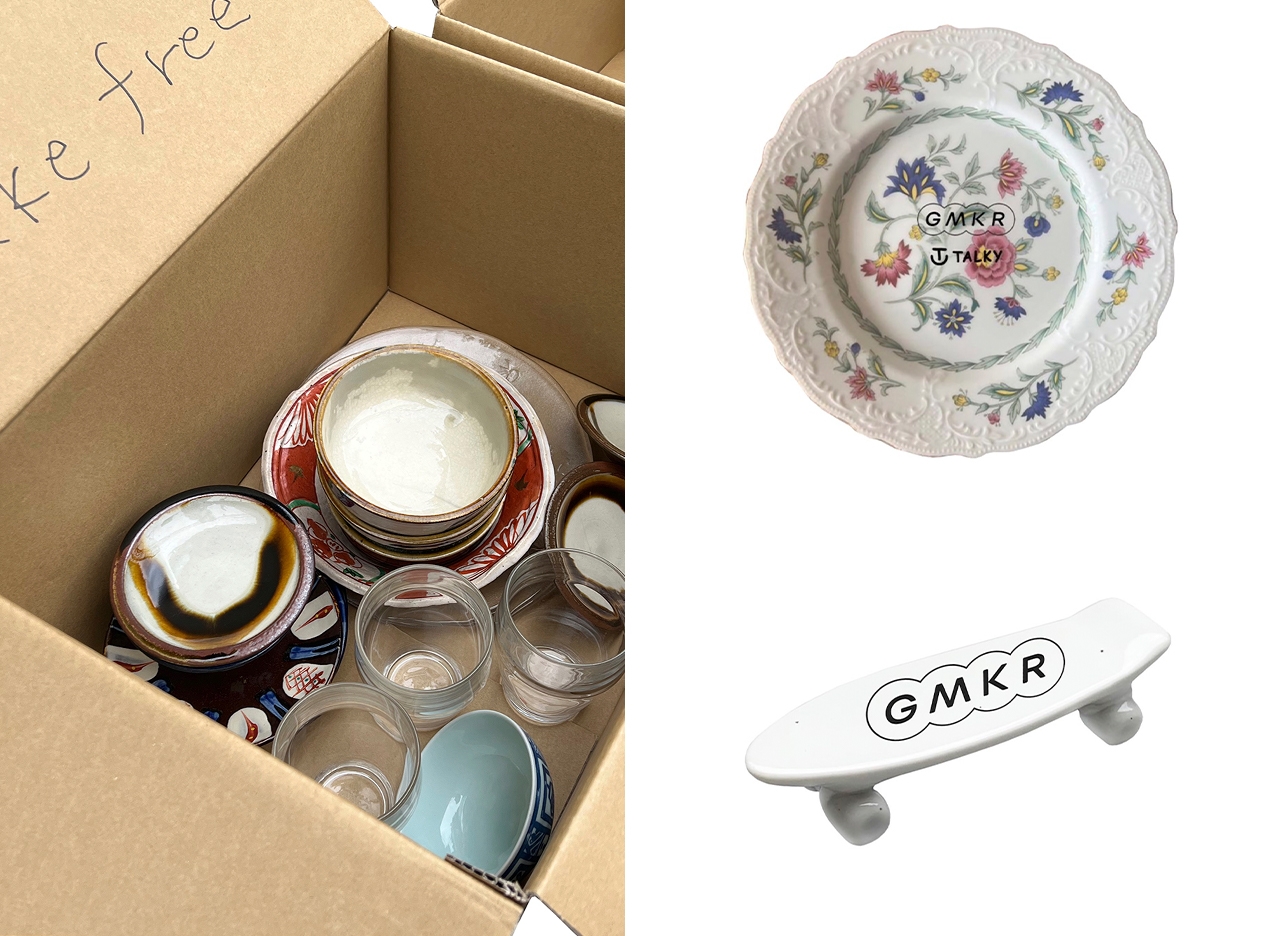 廃棄家具を分解し「芸術(文学と音楽etc)と神様(偶然と神秘)の力によって再構築する」furnitureブランド「GMKR(ゴミカラ)」。3月17日(金)~3月26日(日)の期間中、器に着目した「SUSTAINABLE DISHES DIGs(SDGs)」を実施。この企画は、「GMKR」が路上で偶然出会った「ご自由にお持ち下さい」と書かれた食器から気に入ったものをストックしておいたことから始まる。その食器やスケボー箸置きのB級品にロゴを入れ、ミンゲイプロジェクト 「TALKY」の作品を支えている長崎県の窯で再び焼き直した。廃棄物を違和感だらけの新品食器としてユニークに生まれ変わらせる遊びを満喫して。