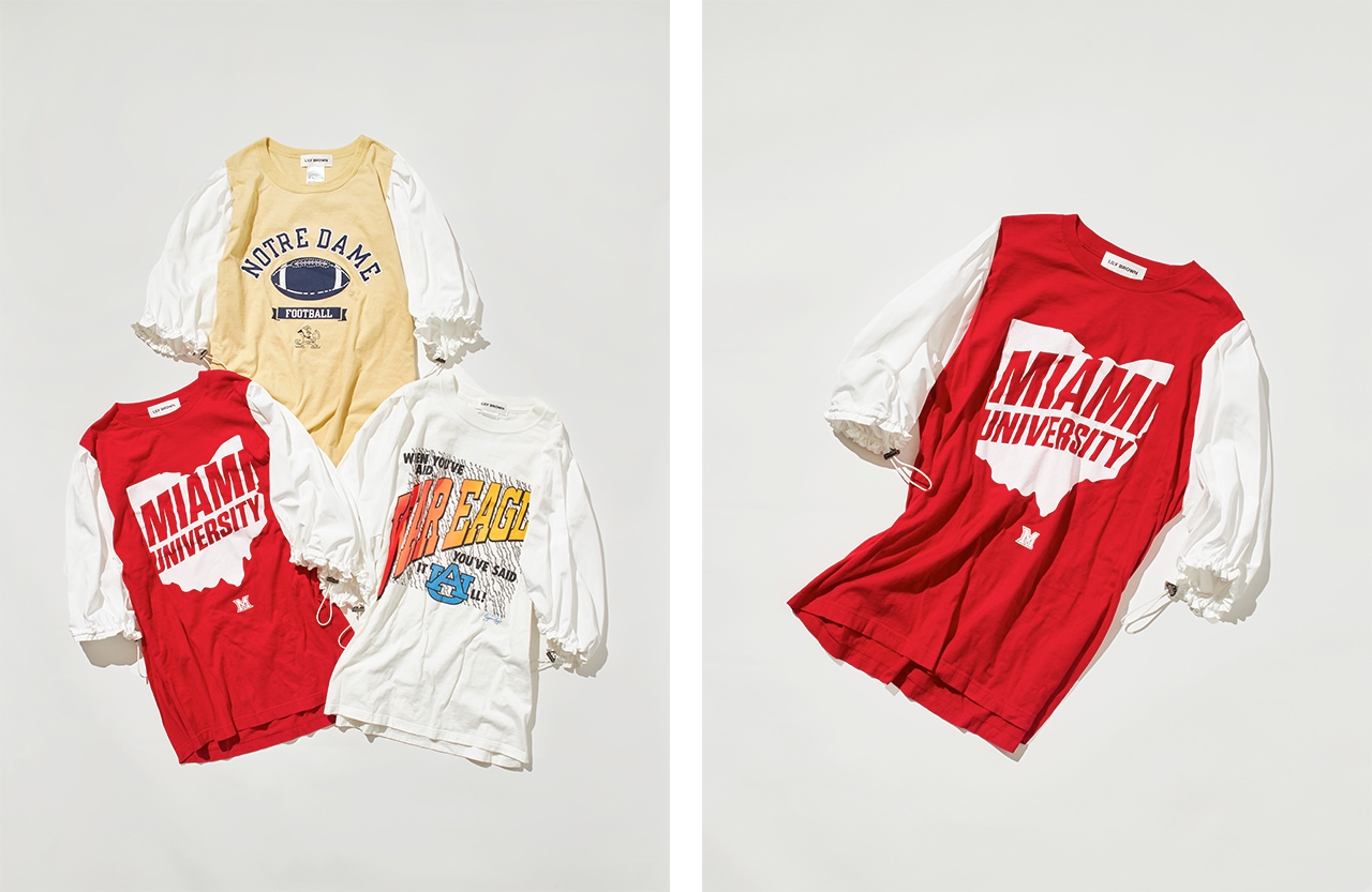 ヴィンテージアイテムの繊細なクラフトワークや独創的なデザインから着想を得て、モダンなリアルクローズを提案する「LILY BROWN」。新感覚でユーズドアイテムを楽しんでほしいと、古着のTシャツやスウェットにエレガントなディテールやアレンジを施し、どれも一点もののリメイクシリーズを展開。また、余った生地や繊維くずから新しい服を生み出すアップサイクルなコレクションにも注力し、廃棄することなく、ものを大切にする循環に積極的に取り組み続けている。大人の女性のワードローブに加えやすいデザインで、ユーズドに馴染みがない人にもおすすめ。