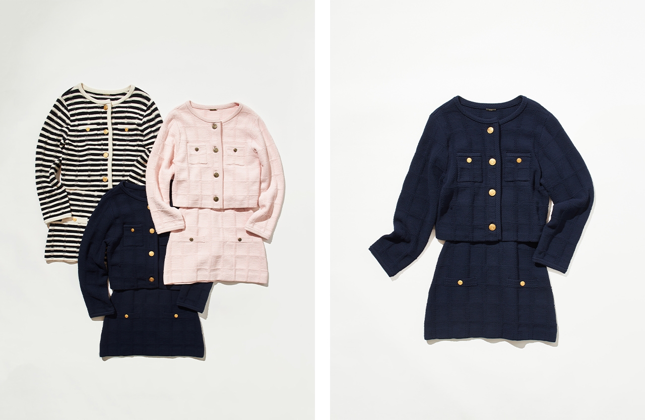 今季も女性らしいシルエットやクラシカルなディテールにこだわり抜いた、サステナブルな新作をラインナップ。再生可能資源である木材を原料としたエコレーヨンを用いることで、二酸化炭素の排出量や水質汚染を最大50%も軽減し、環境に優しい服作りを実現させた。この素材を使ったクラシックなニットジャケットとミニスカートは、ツイードのような編み模様がトレンド感たっぷり。さらりと羽織れるジャケットは、タイトなミニスカートとセットアップでスタイリングするのもおすすめ。デイリーに活躍してくれるアイテムで、華やかな春の装いを楽しみたい。