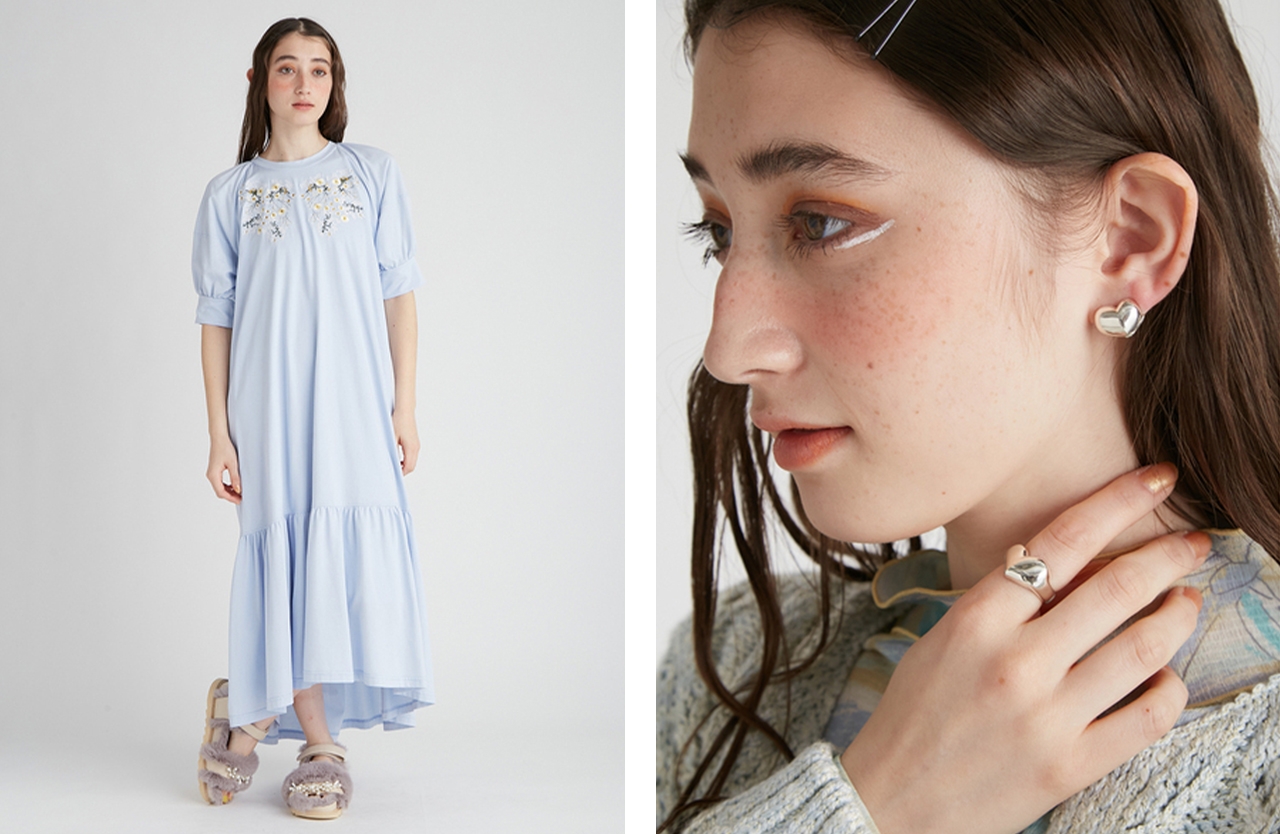 (左)フラワー刺繍鹿子ワンピース ¥24,200(右)リサイクルシルバーピアス ¥17,600、リサイクルシルバーリング ¥11,000