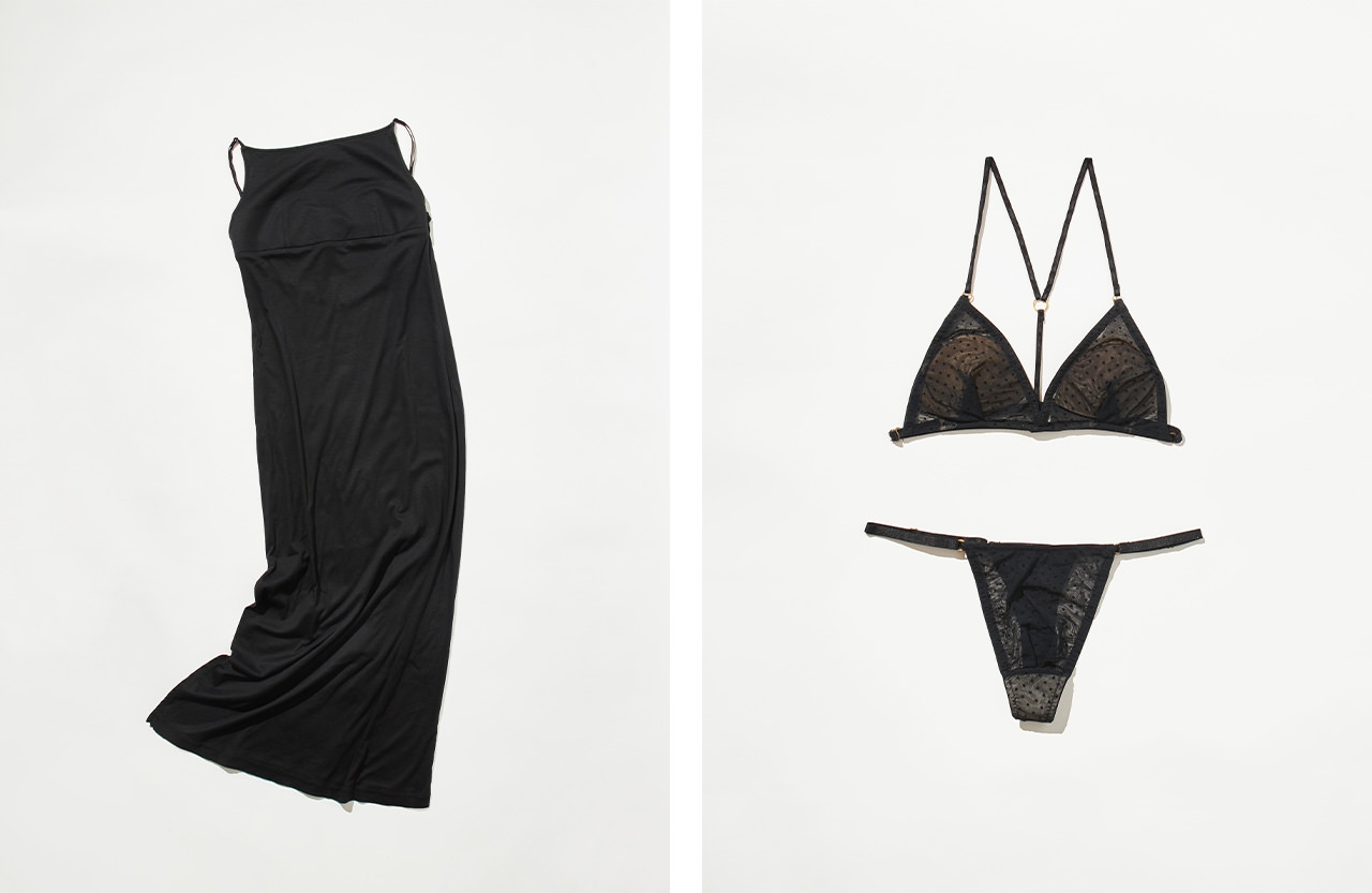 (左)Tsuya Open Back OP ¥19,250(右)No.5 Dot Lace Triangle Bra&Tanga ¥18,810