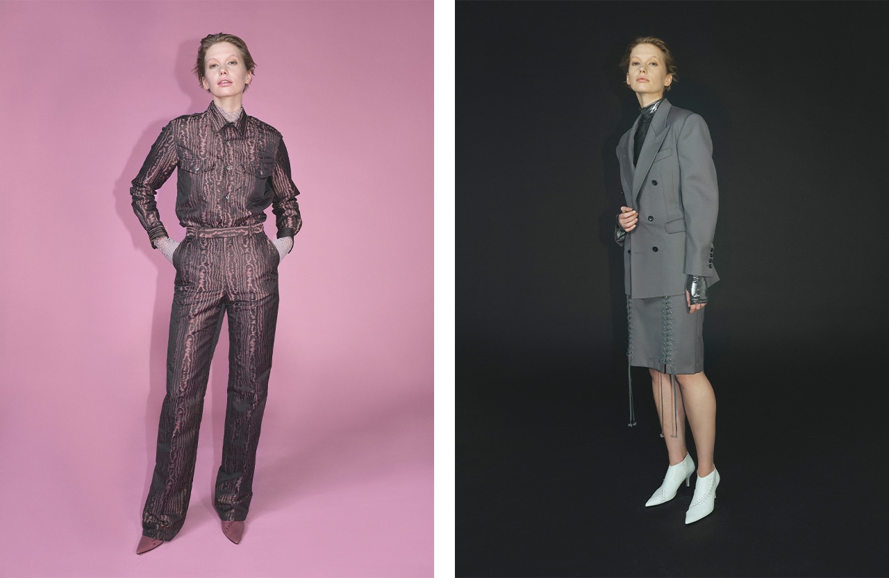アメリカ人写真家、アーヴィング・ペンのポートレート作品から着想を得た今季は、マルセル・デュシャンやジャン・コクトーなど、ペンの被写体だった時代の寵児たちからインスパイアされたテイラードピースを発表。素材やディテールの組み合わせでクラシックなアイテムをモダンにアップデートし、ライダースや MA-1 ジャケットなどには、アクセントとしてリングジップを用いた。ウィメンズはメンズライクなジャケットスタイルに背面はレースアップをあしらうなど、フェティッシュなムードも感じられるデザインに。7月21日(金)より順次発売。